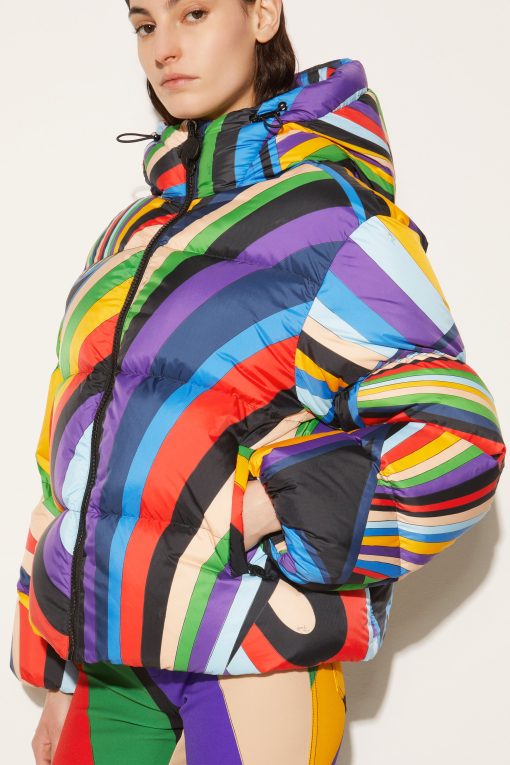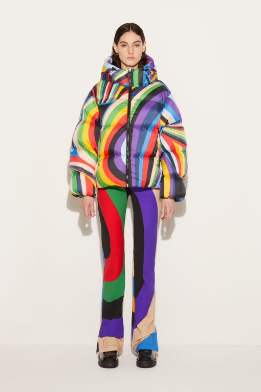 Emboldened by Pucci’s signature pattern play, this jacket is covered with the Iride print in high-contrast white, black and pastel pink. It’s made from a technical fabric and padded for extra warmth, with an integrated hood and funnel neck to block out cold and lock in heat.