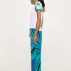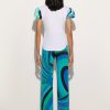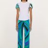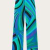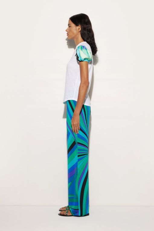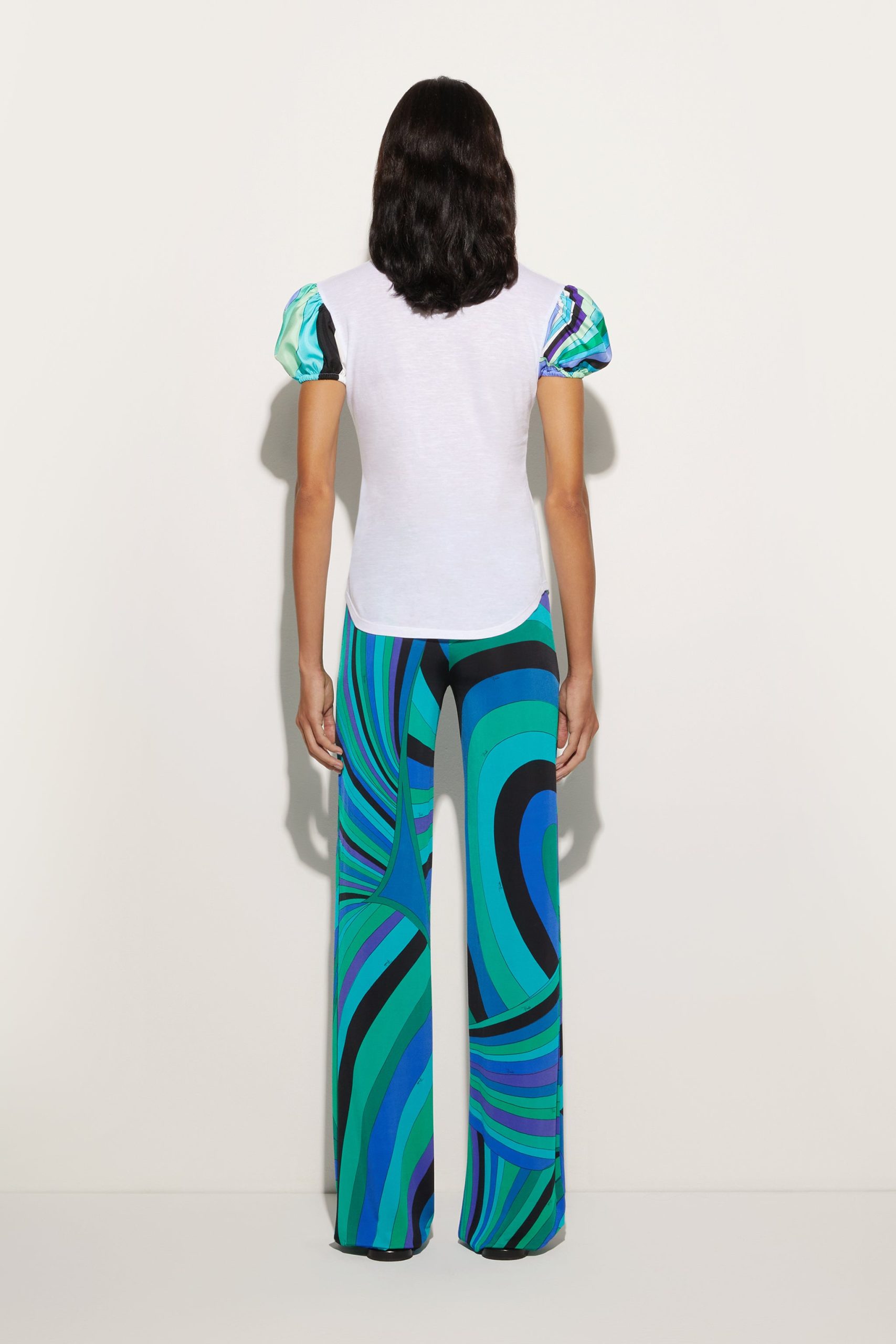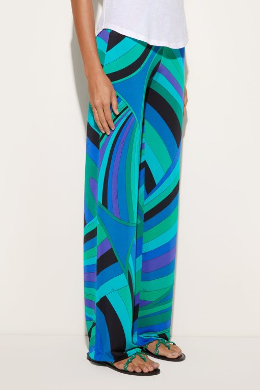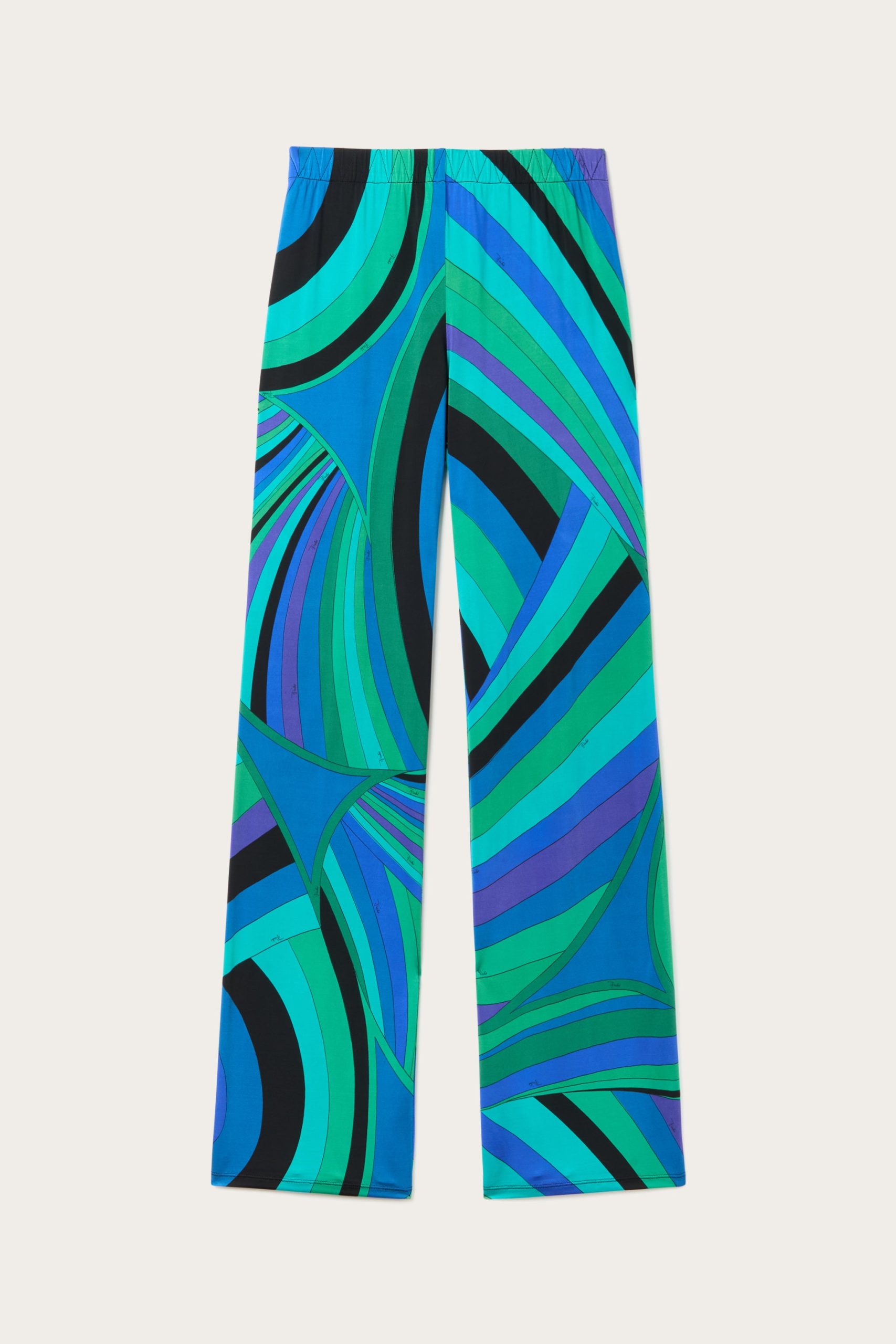 An essential garment with sophisticated appeal. These straight-cut mid-rise pants offer a fluid, timeless elegance, thanks to the lightness and sheen of satin jersey. The fabric hugs the silhouette naturally, ensuring a comfortable and refined fit. The Iride print in emerald shade enhances the movement of the fabric, creating a dynamic and sophisticated effect. Perfect for adding a distinctive touch to your wardrobe, with the unmistakable Pucci imprint.