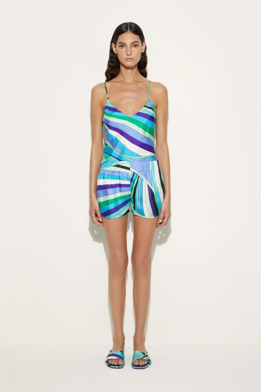 With an elasticized waist and hems, these shorts give a soft, rounded fit for a cool, intimate and sophisticated look.Silk twill enhances the natural sheen of the fabric and lends a touch of sophistication to the pattern. The delicate and feminine Iride print in green and lilac adds a sense of fluid movement. Pair it with the matched top for a total Pucci look.