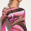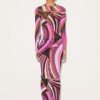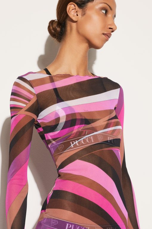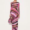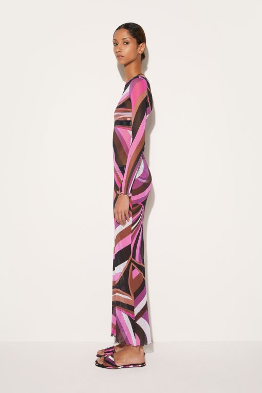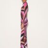 This semi-sheer tulle dress is decorated with the Iride print’s energetic rays in a medley of vibrant pinks. The boat neckline is an enduring Pucci signature.