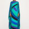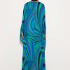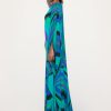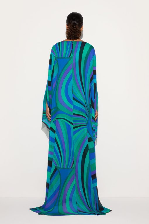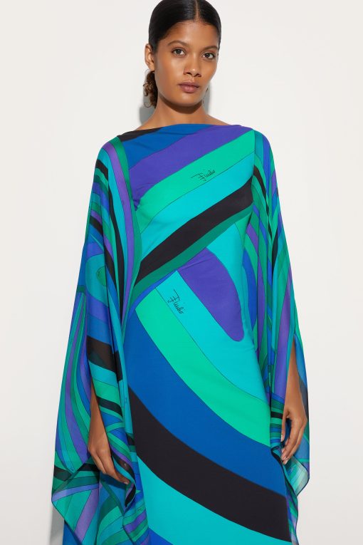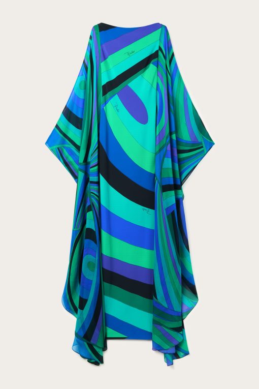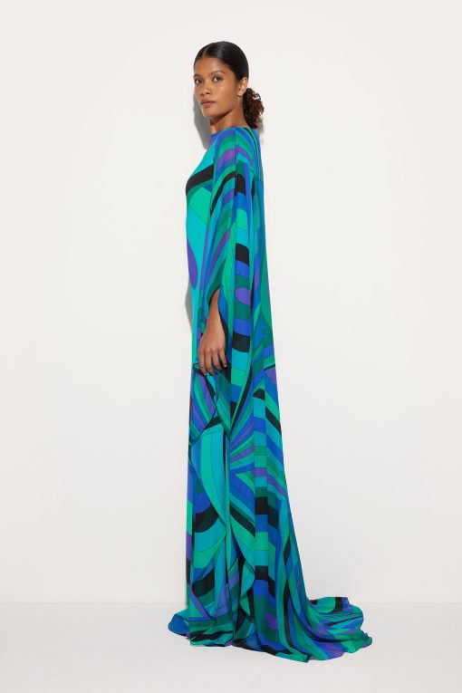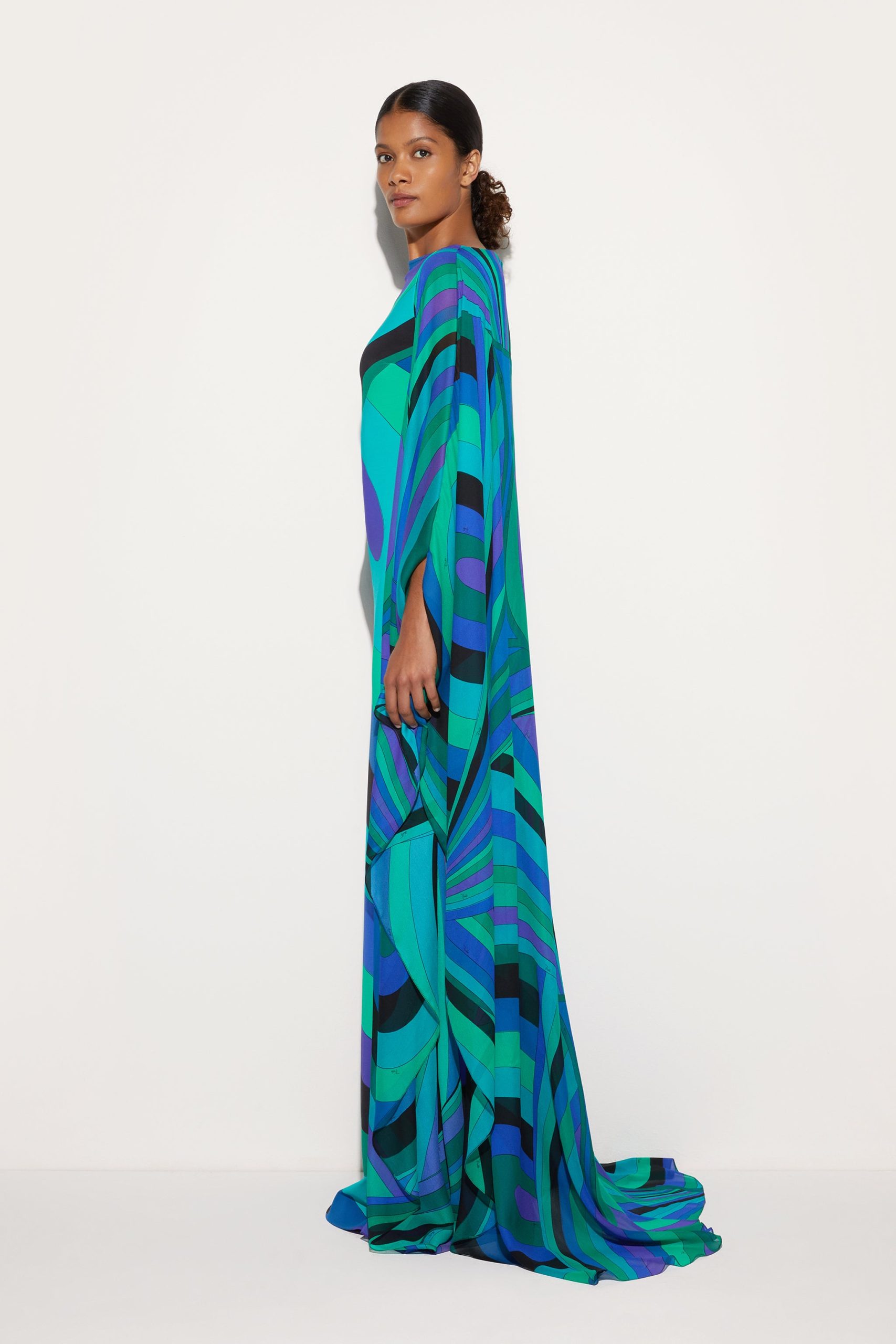 A dress that celebrates movement and femininity with extraordinary grace. The long, fitted silhouette, embellished with wide cape sleeves, wraps the body in a jersey that sculpts and enhances the shape with elegance.The enlarged version of the Iride print makes each garment a unique work of art. The emerald hue adds depth and mystery to the design, evoking the beauty of nature and the dynamism of the fashion house. Wear it for special evenings or to feel flawless on an important occasion-this dress can only make you the queen of the party.