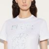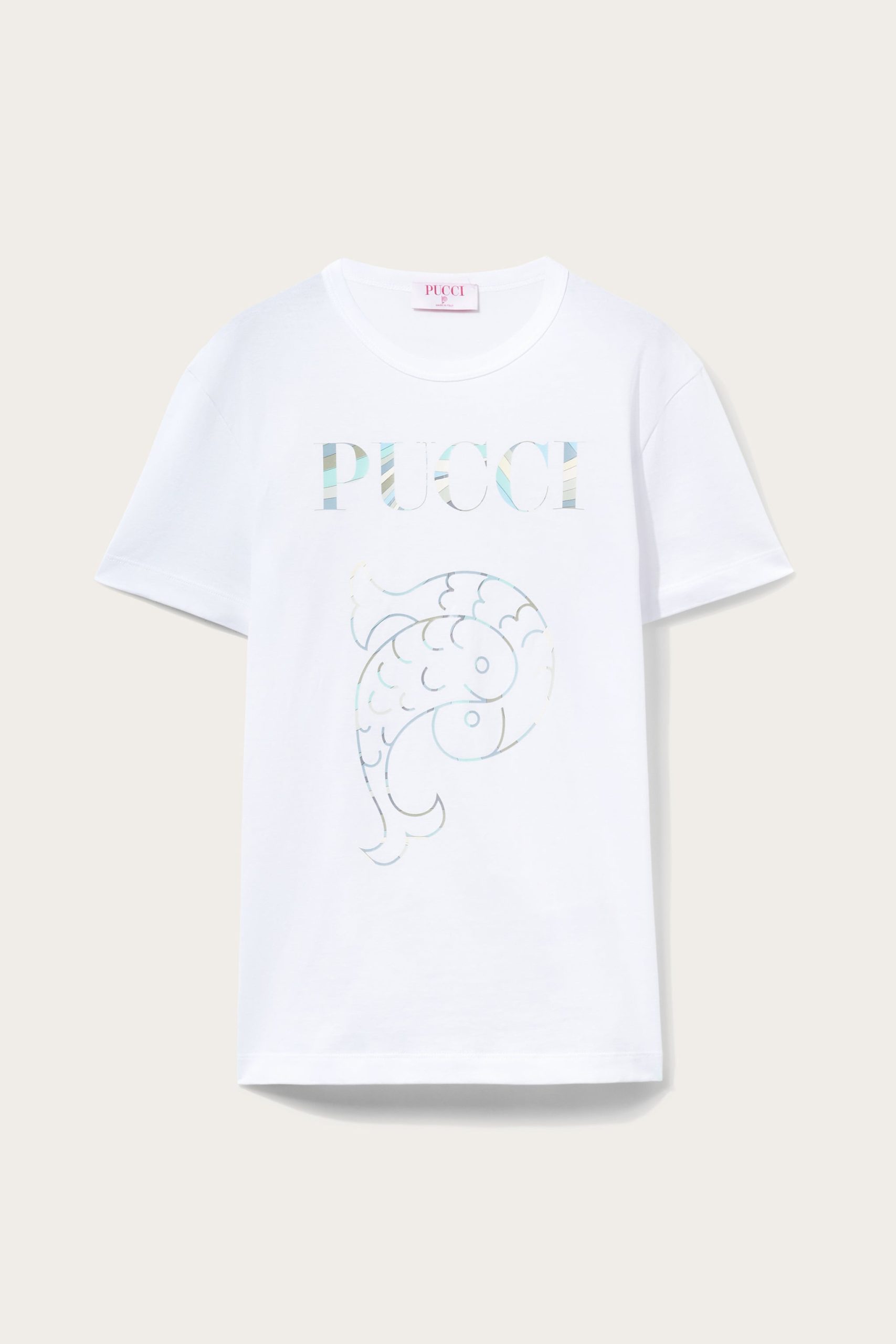 Pucci’s moniker and intertwining fish logo enliven this T-shirt. They’re traced with the Iride print in soft blue shades: a nod to the house’s oceanic inspirations.