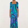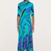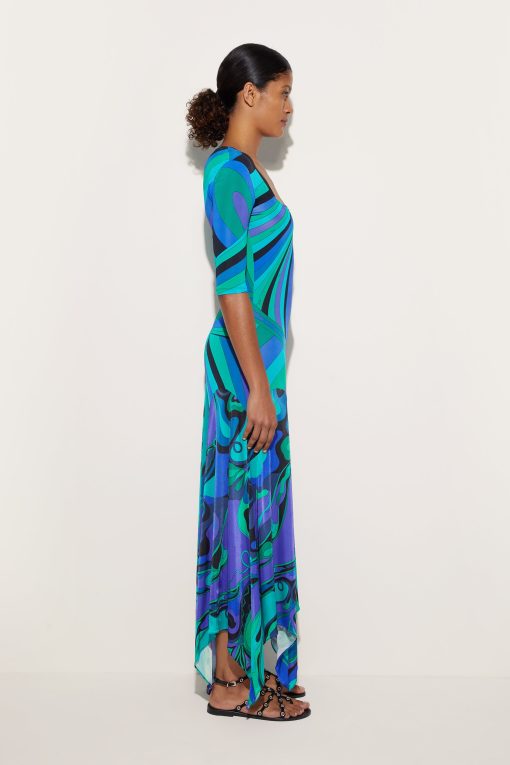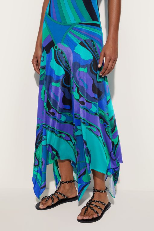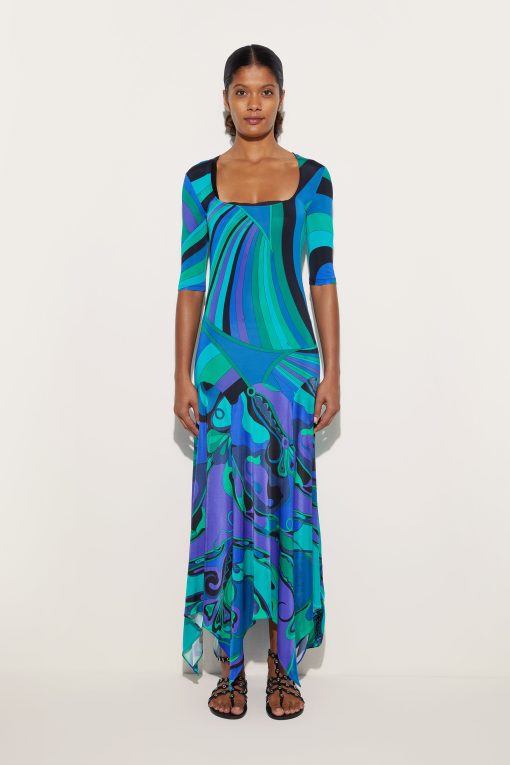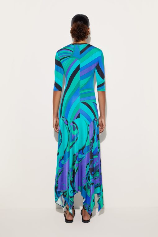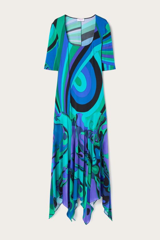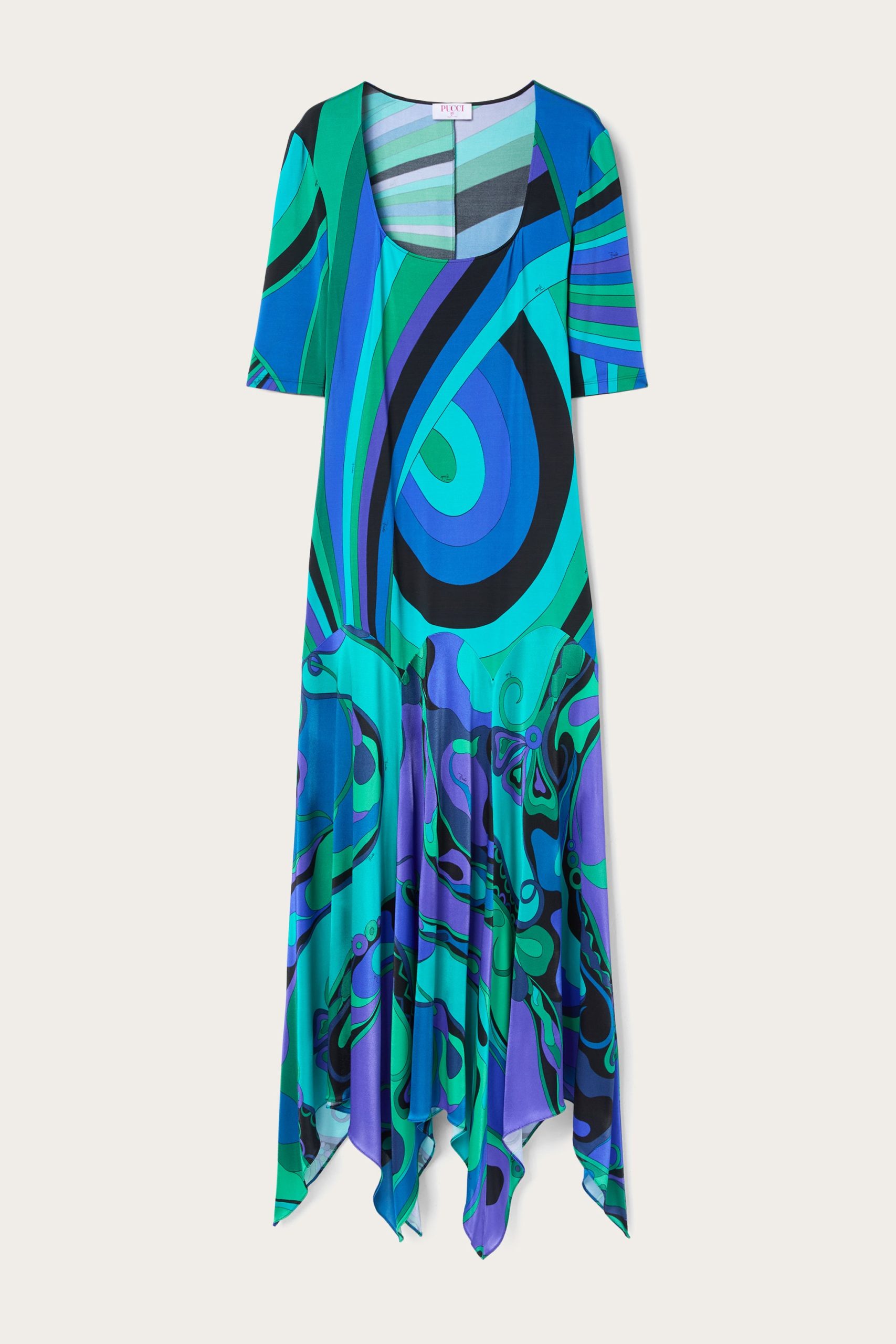 A tribute to Emilio Pucci’s visual poetry, this long dress with elegant bottom pleats stands out for its fluid design and timeless appeal. The Iride motif offers a fascinating vision reflecting a handcrafted sophistication and hand-drawn aesthetic reintroduced by art director Camille Miceli. Made of emerald jersey satin, the dress combines the sheen of the fabric with a contemporary design, perfect for evening events or memorable occasions.