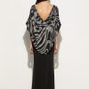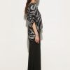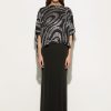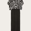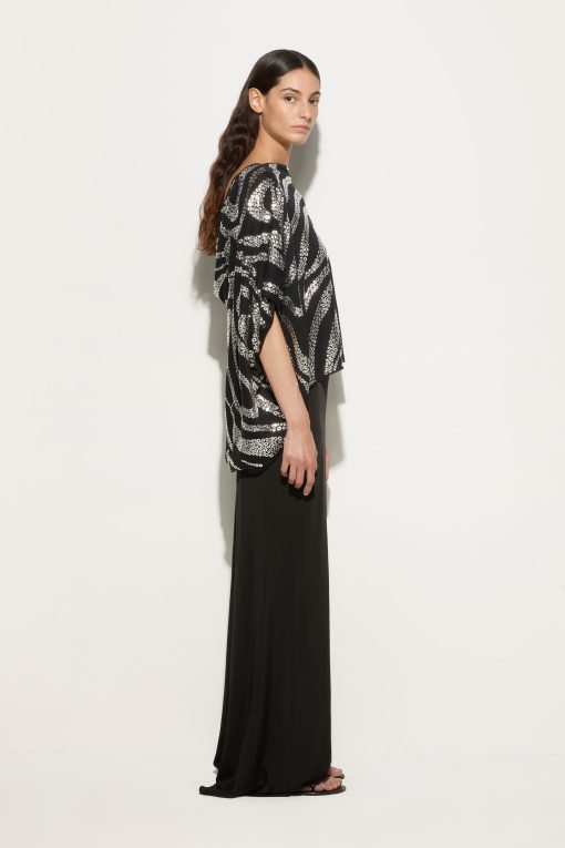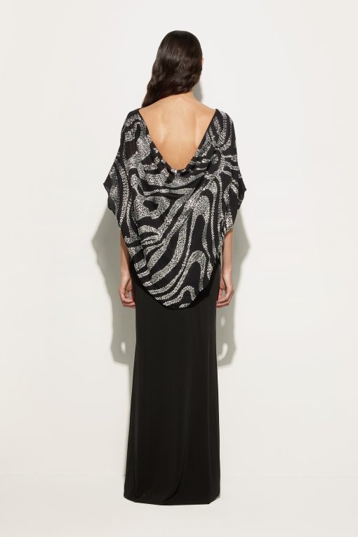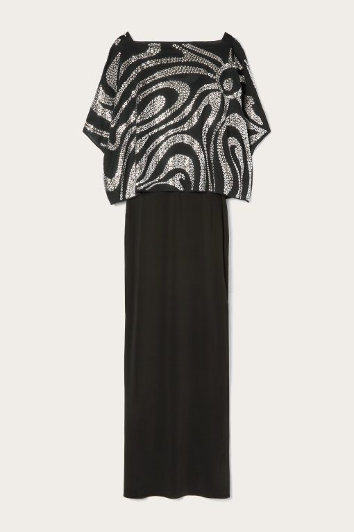 A decisive and contemporary elegance characterizes this straight-cut long dress, embellished with a sleeveless cape top decorated with a sophisticated play of metal studs. A garment with a sculptural and dynamic look, perfect for those who love to stand out in style. Made of extremely stretch viscose, it combines comfort and sensuality, accompanying every movement with fluidity. Ideal for evening events or to add a touch of glamour to a special evening.