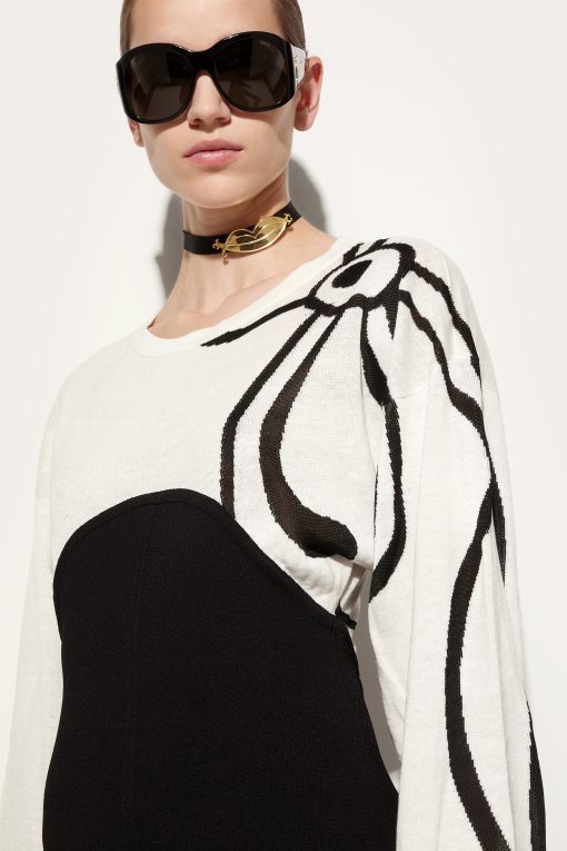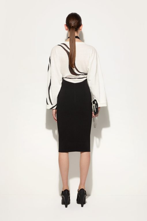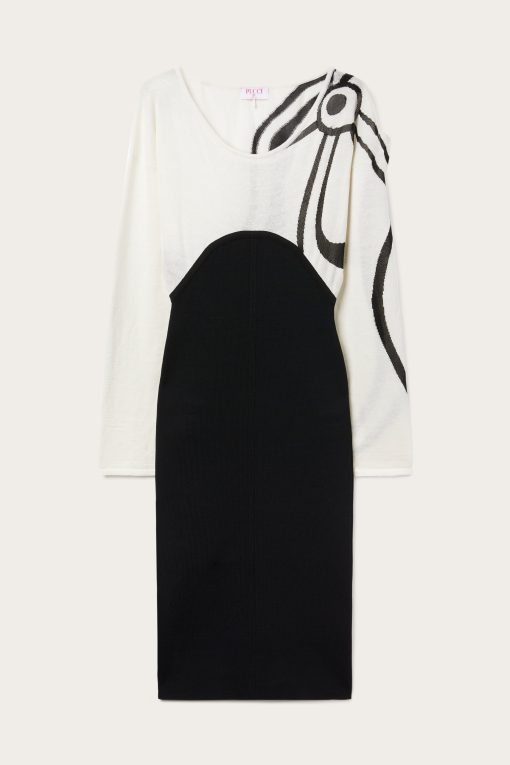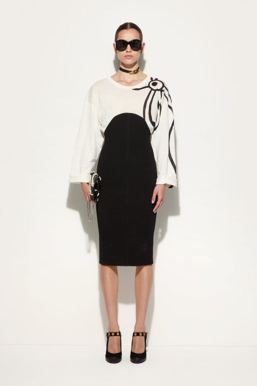 A perfect balance between essentiality and sophistication. This longuette dress combines the comfort of a T-shirt-style top with the sophistication of a Marmo print detail bottom, creating a contrast of textures and shapes with contemporary appeal. Made from a combination of linen, cotton, and compact viscose, the fabric offers a lightweight yet structured feel. The black and white design enhances the minimalist elegance of the garment, making it perfect for those seeking a distinctive and unmistakably iconic look.