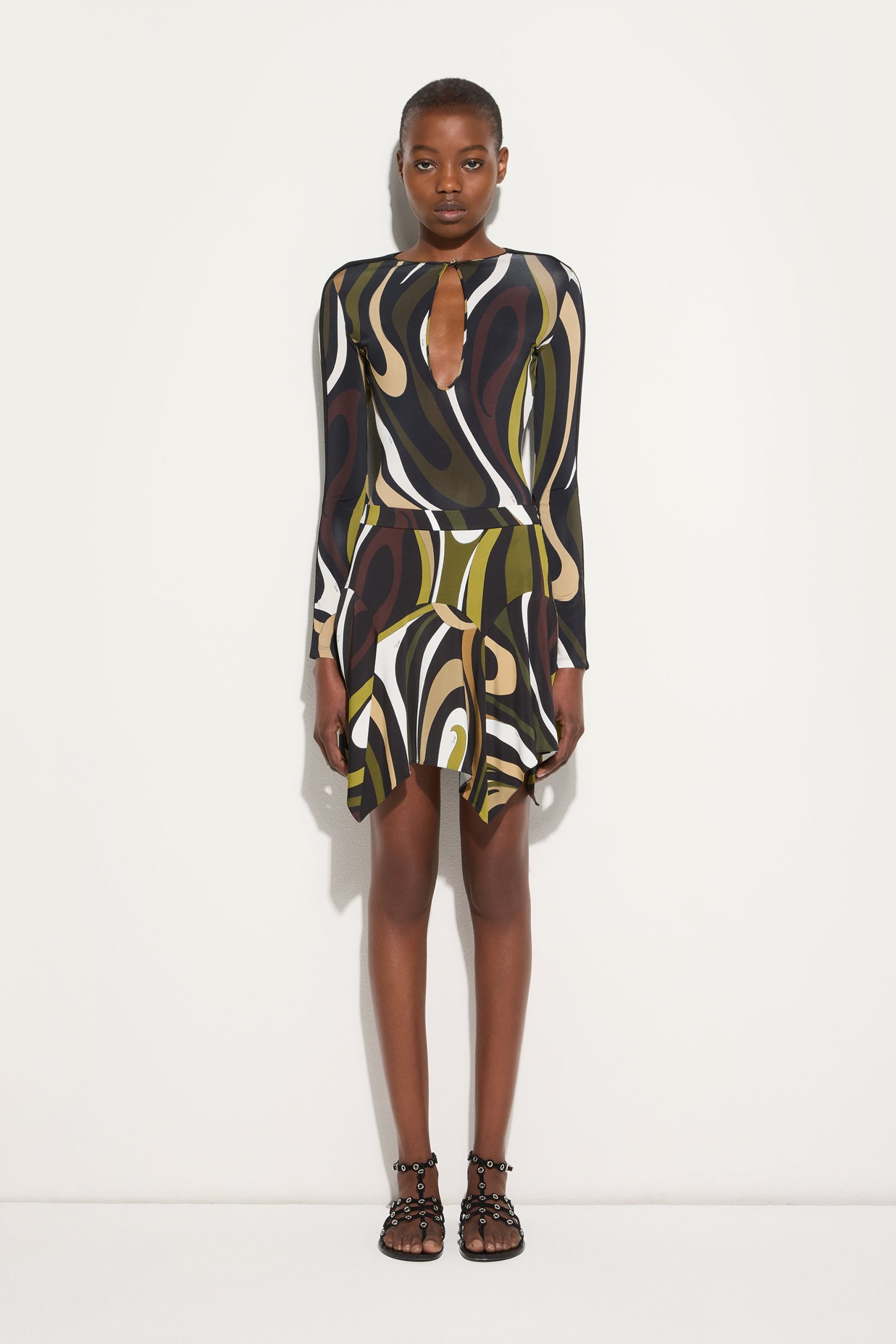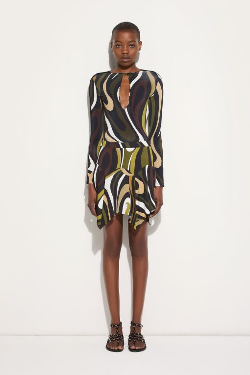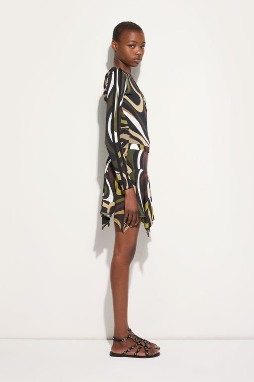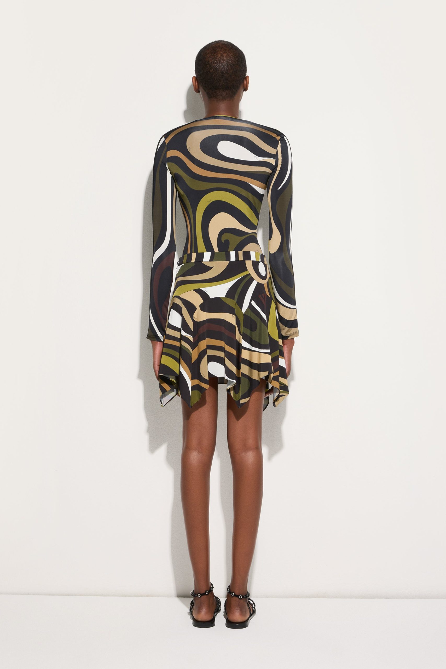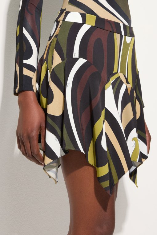 A dynamic and modern silhouette for a mini skirt that plays with proportions thanks to its asymmetrical hemline. The fabric hugs the figure with a fluid and stretchy fit, ensuring comfort and freedom of movement. The khaki Marmo print adds depth and character to the design, enhancing Pucci’s graphic and distinctive spirit. An essential garment with contemporary appeal.