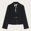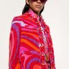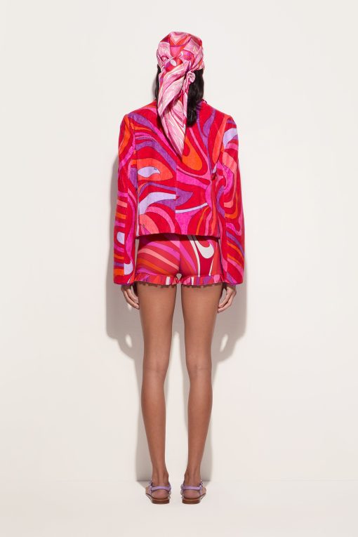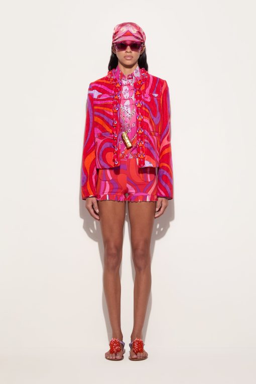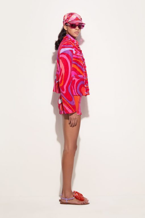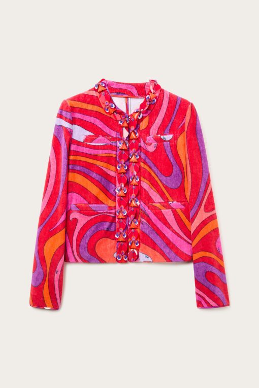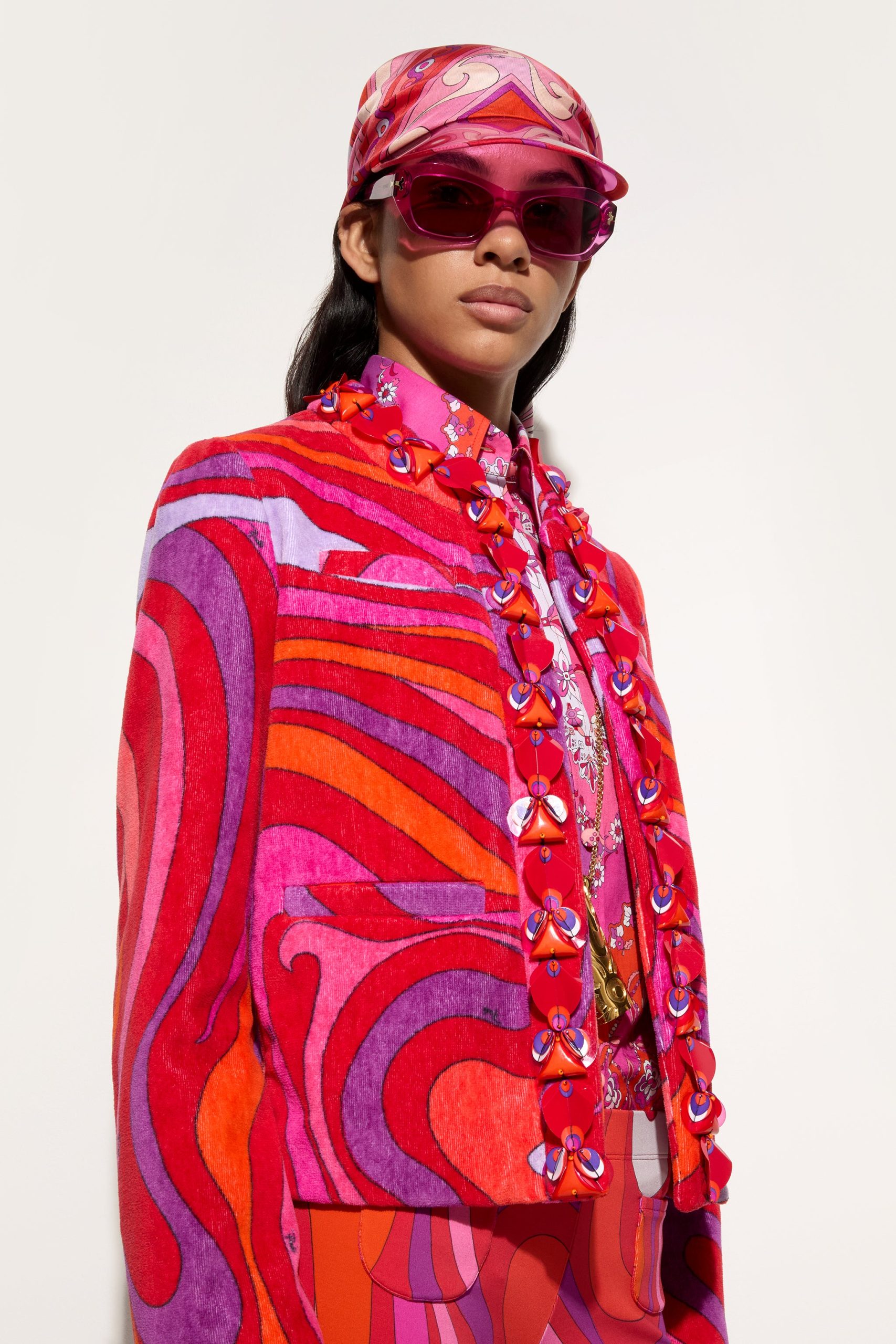 A garment that combines craftsmanship and creativity, perfect for those seeking a sophisticated yet personality-rich look. This jacket features padded twill details around the cuffs and chest, enhanced by a round collar and elegant buttons that give a touch of class.Edges decorated with orange plastic triangles and folded sequins of different sizes and colors add a playful and light effect. Handmade embroidery echoes the unique spirit of the Pucci Pesci logo, celebrating the house’s distinctive style. Marmo print in coral/fuchsia completes the design with a burst of energy and vibrancy.