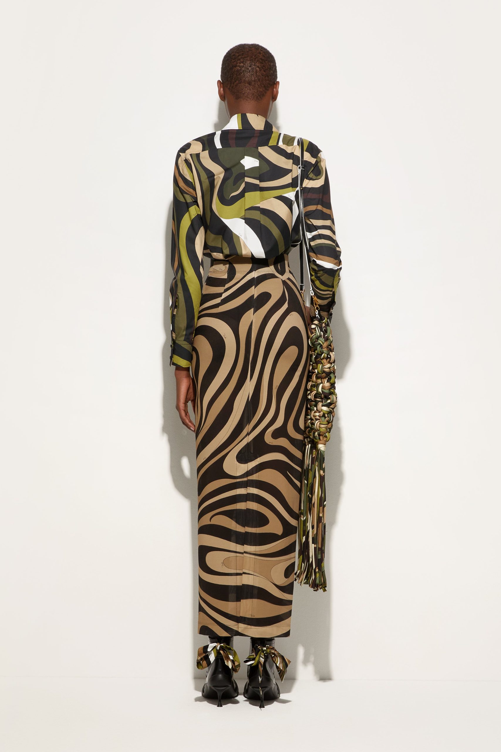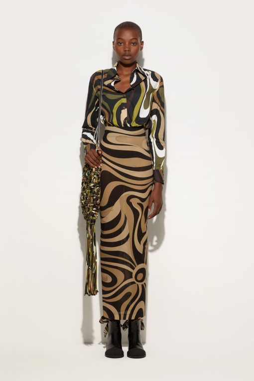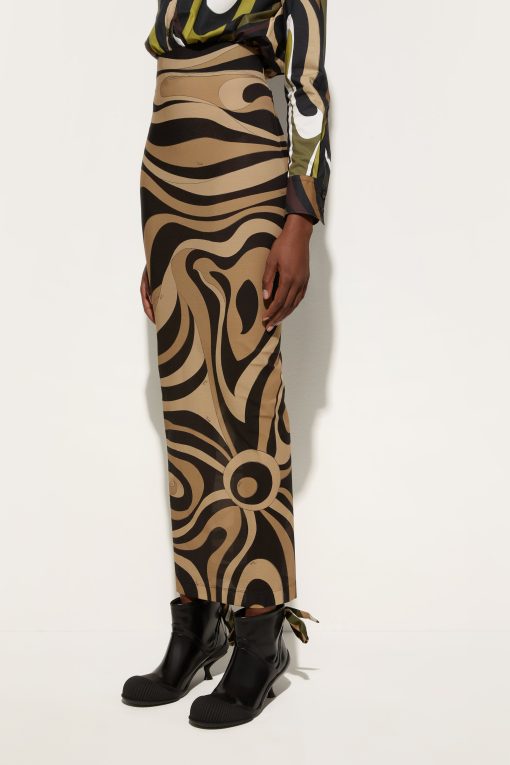 Timeless elegance and a silhouette that enhances the female form. This high-waisted calf-length skirt is a perfect balance between refinement and versatility. Made with a body-hugging design, it gracefully envelops the figure, enhancing femininity with a clean and sophisticated line. The black and beige Marmo print adds a distinctive touch, making it ideal for both formal and casual looks.