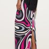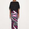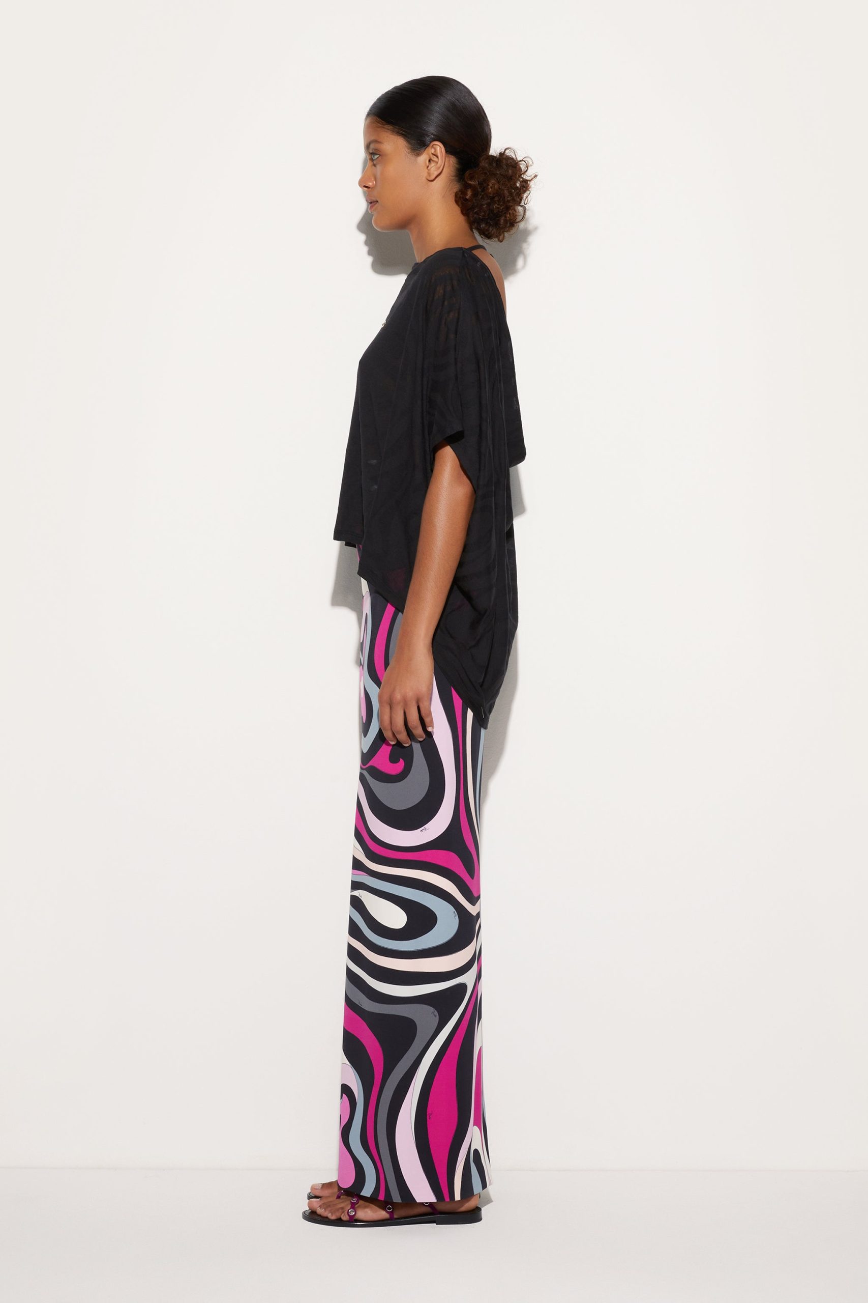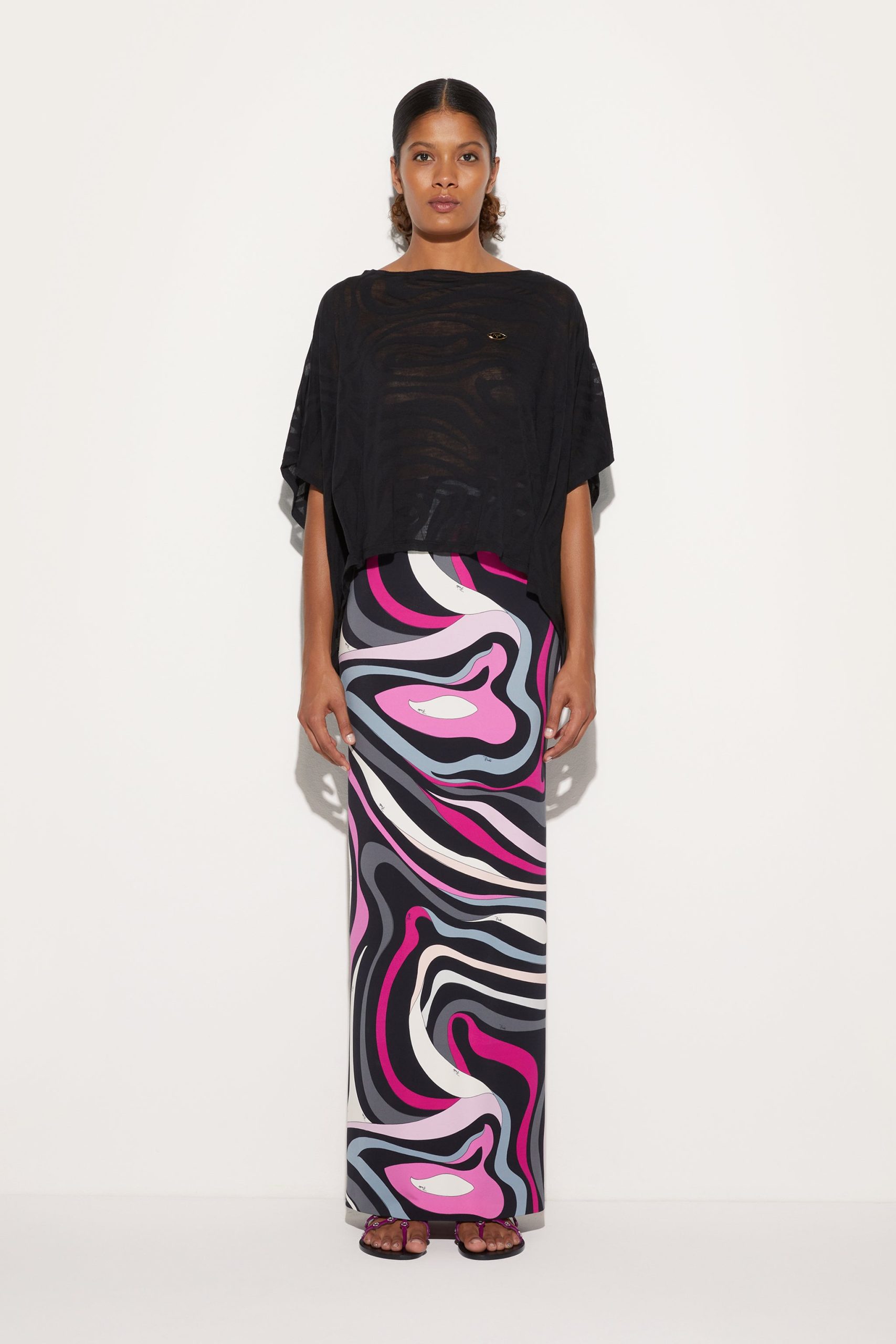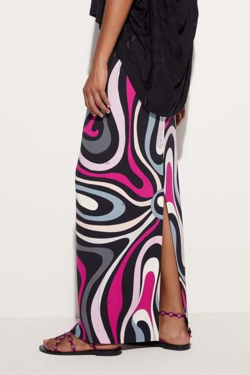 A garment that sculpts the silhouette with elegance and character. This high-waisted calf-length skirt is the perfect ally for sophisticated and contemporary looks. Thanks to the super stretch compact viscose jersey, it offers a snug fit and a slight compressive action that naturally enhances the figure. The Marmo print in black and fuchsia gives the design a lively touch, transforming it into a truly unique piece. Ideal for office outfits paired with a flowing blouse, or for a glamorous evening with a tight top and heels.