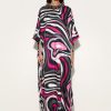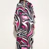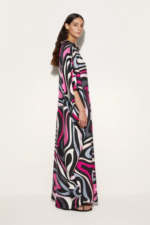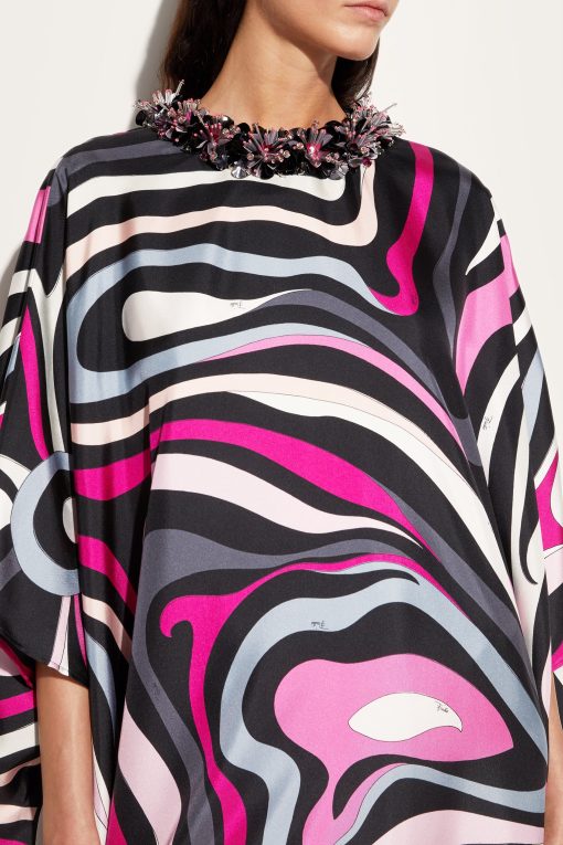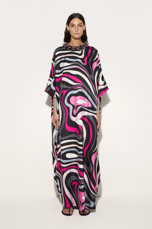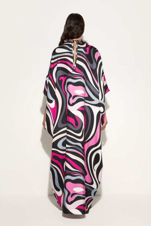 A garment that embodies luxury and sophisticated femininity. This loose-fit kaftan is perfect for those who seeks elegance and comfort in one. The distinctive detail is the embroidery on the neckline, handmade with folded and ruched sequins in various shapes, sizes and colors, and enriched with long beads and sparkling rhinestones. A work of art that gives light and personality to the garment.The iconic Marmo print adds a graphic and modern touch, making it the perfect garment for elegant events, summer evenings or stylish moments of relaxation.