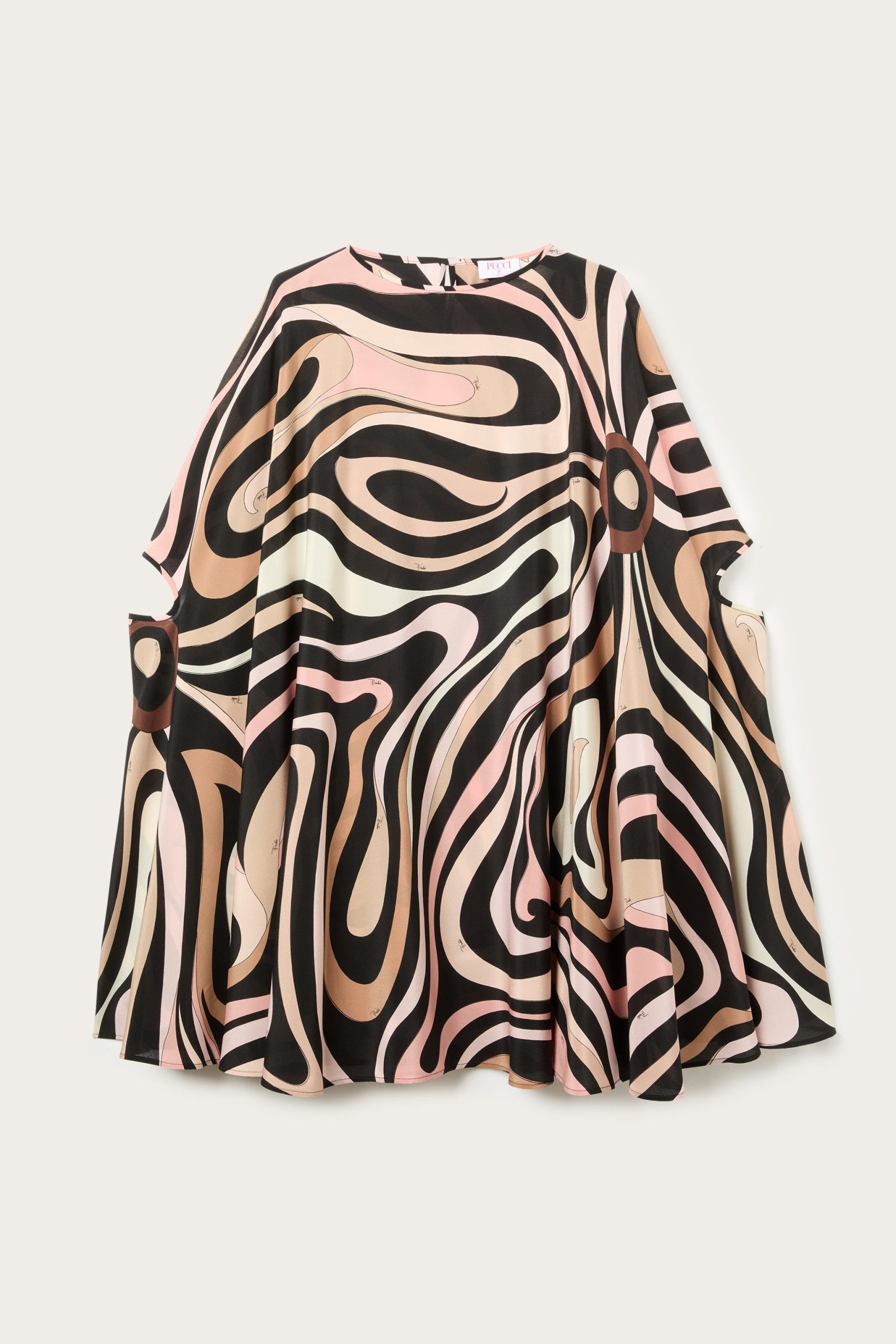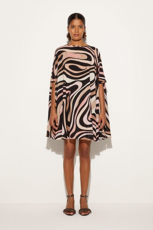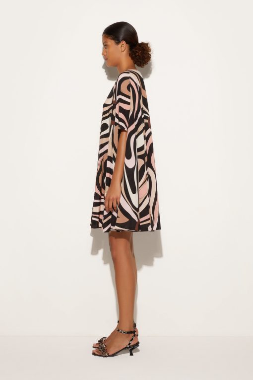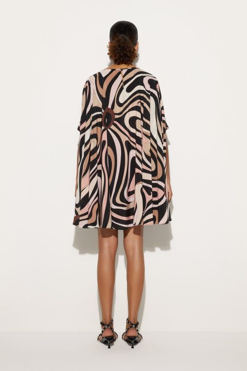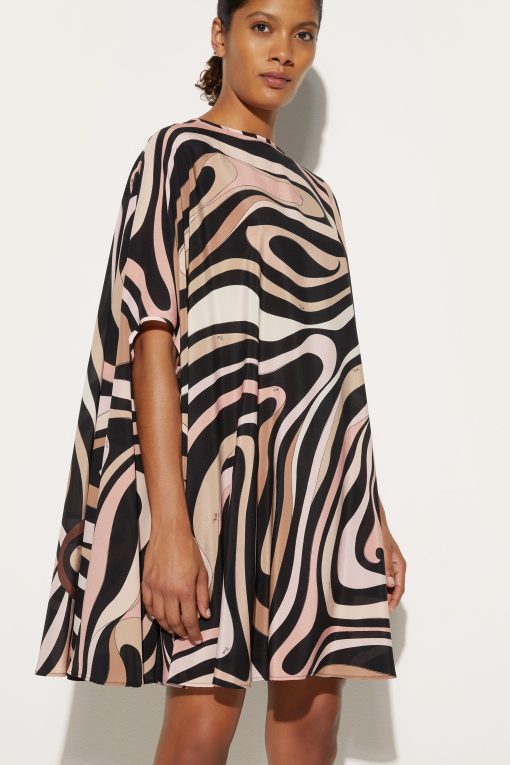 A classic revisited with a modern and sophisticated twist. This mini kaftan is the perfect combination of lightness and character, thanks to its fluid silhouette and iconic Marmo print in black and nude that enhances its appeal by adding depth and movement, making it a fresh, feminine garment full of personality.Perfect for city days or summer evenings by the sea, it is a garment that plays with sophistication and comfort.