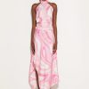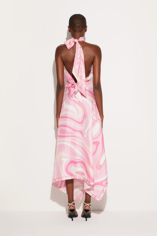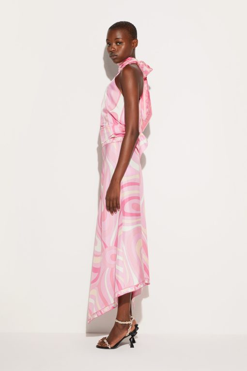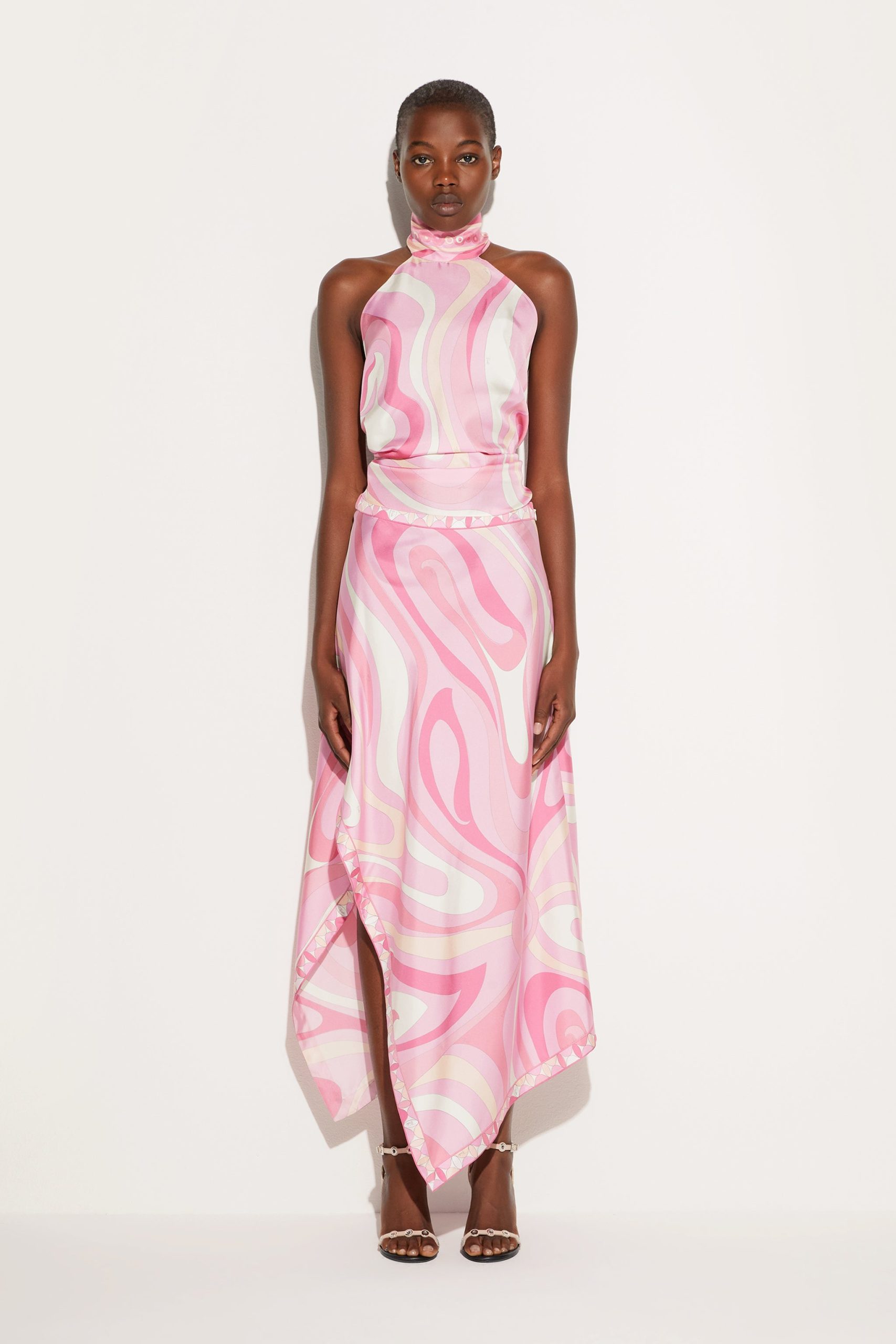 Clean lines and timeless elegance characterize this strapless high-neck top. Made of 100% silk, the fabric glides lightly over the skin, emphasizing the fluidity of the design and giving a feeling of sophisticated comfort.The Marmo print in pink enhances the garment with its play of dynamic veins, adding depth and a distinctive touch to Pucci’s style. A refined and minimalist piece, perfect for those who love refined details.