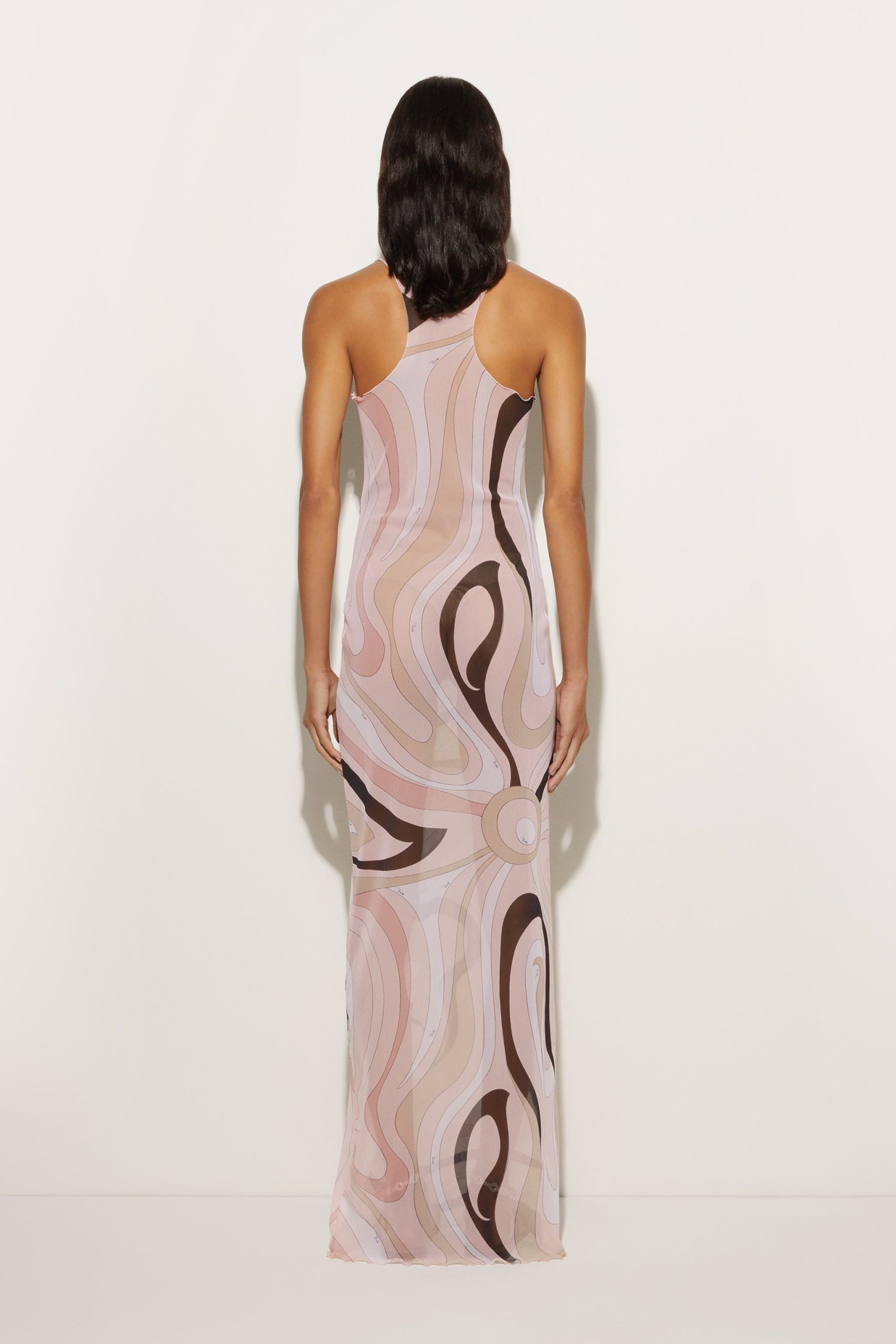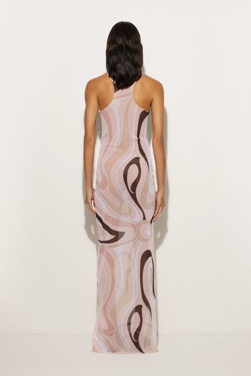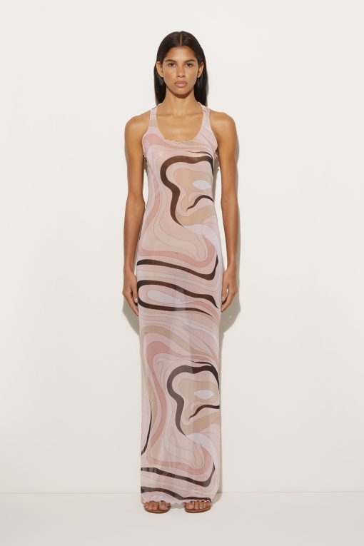 A long dress that blends simplicity and elegance, a sensual contemporary mermaid costume. With its round neckline, straight cut and sleevelessness, this garment fits naturally to the silhouette, enveloping the body like a second skin. Made of a lightweight stretch tulle that combines comfort and style, it is further enhanced by the iconic Marmo print, which adds movement and vibrancy to the design, making this dress ideal for special occasions or elegant evenings.