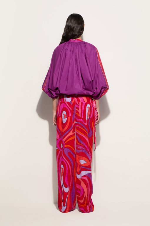 A perfect balance of style and everyday comfort. These wide-leg pants, with a comfortable, relaxed fit, are designed for those looking for a versatile garment with character. Made of soft cotton, they offer a lightweight and durable feel, making them ideal for any destination: work, leisure and travel.The Marmo print in coral and fuchsia tones adds an artistic vibrancy, making these pants a unique element of your wardrobe.