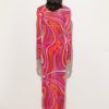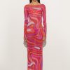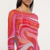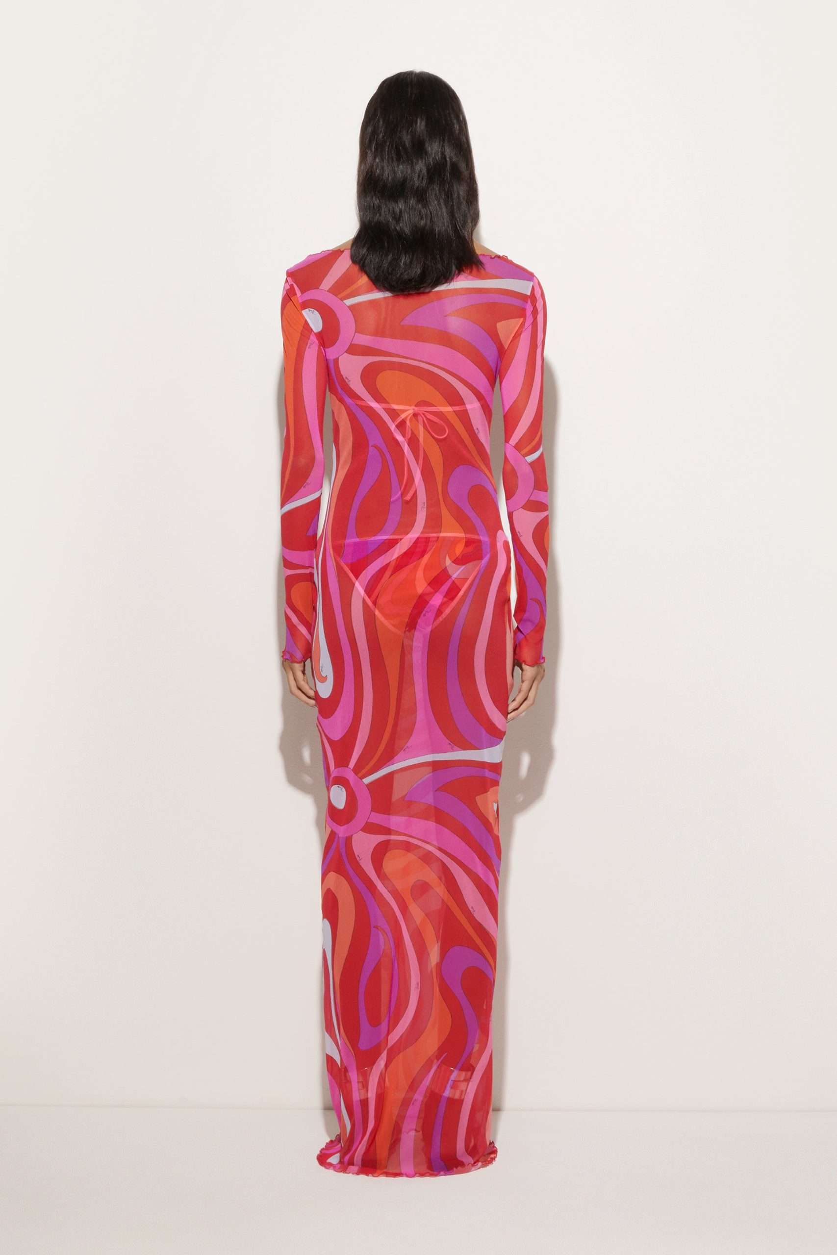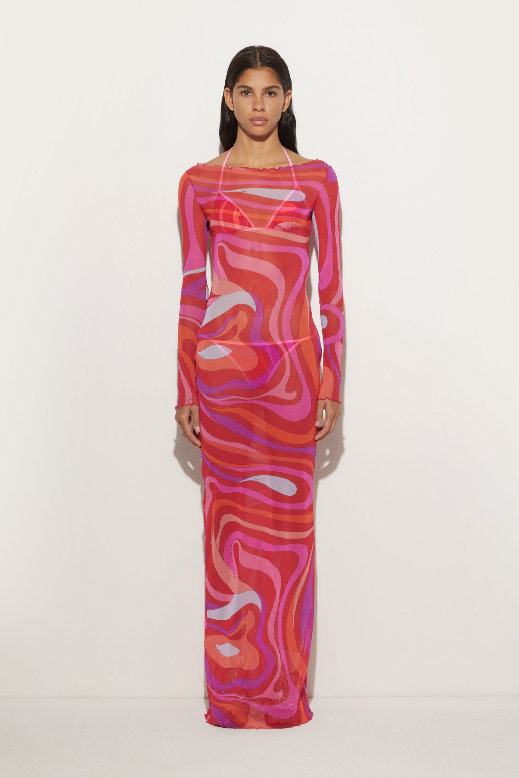 A wearable work of art, this stretch tulle long dress captures the essence of Pucci DNA with its iconic Marmo print in vibrant shades of coral and fuchsia. The transparency of the lightweight fabric, as soft as a second skin, makes it perfect for a surprising and colorful layering effect: ideal to pair with the maison’s iconic costumes for a unique and bold look. Designed for those who love to play with style, it is the ideal garment for exclusive vacations or events by the sea.
