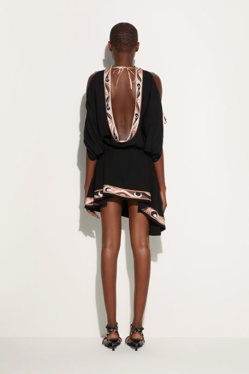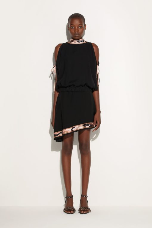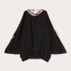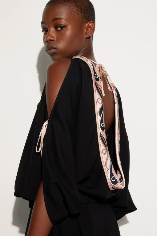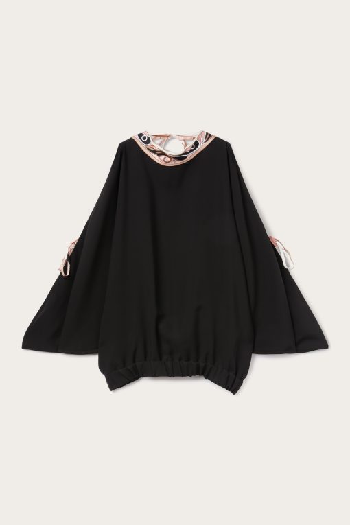 If you’re looking for a refined garment with casual elegance, this blouse is the perfect choice. The high neck adds a sophisticated touch, while the cape-style silhouette lends movement and lightness.The refined black, mixed with the delicate printed details, makes this blouse a distinctive piece.