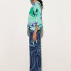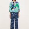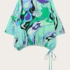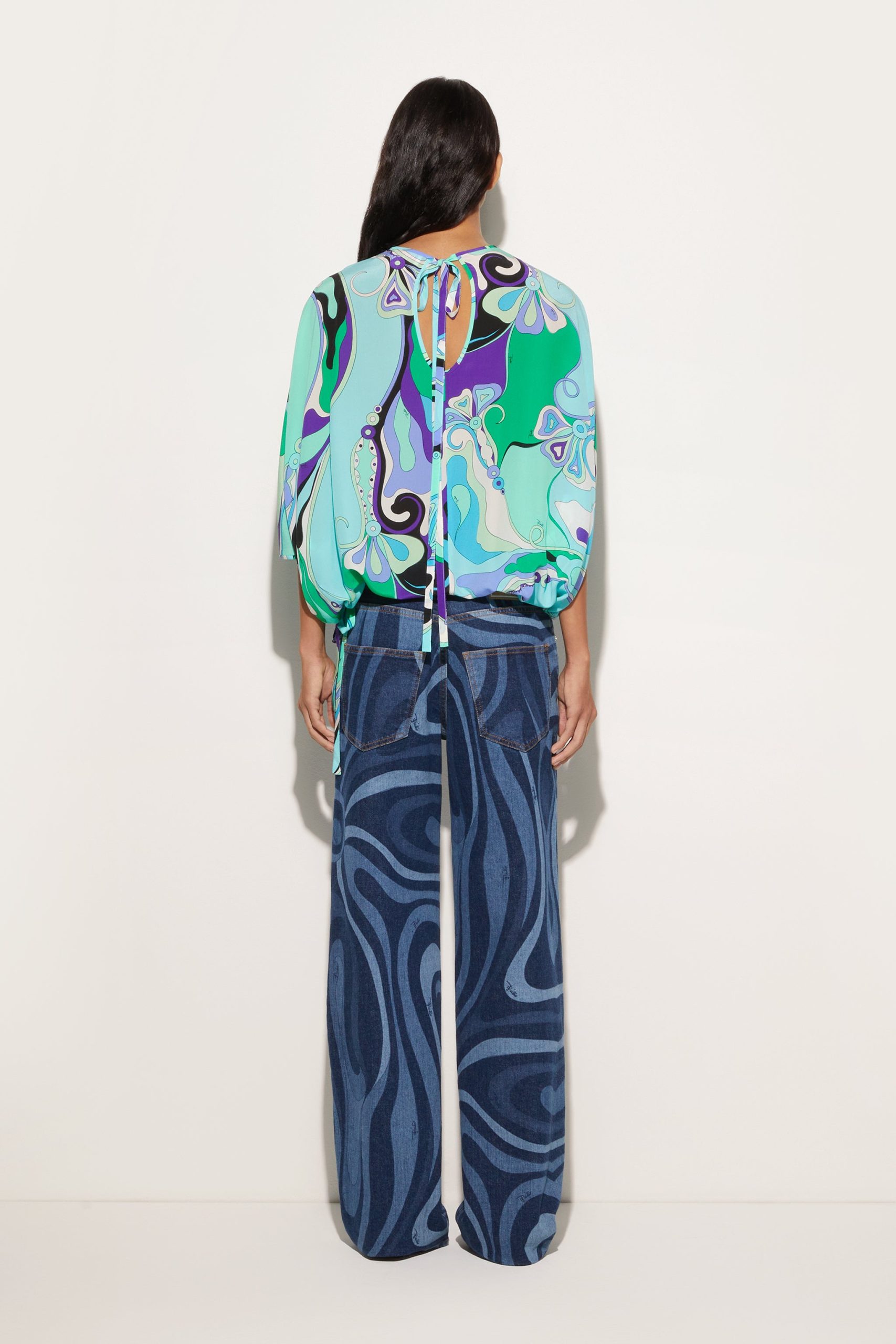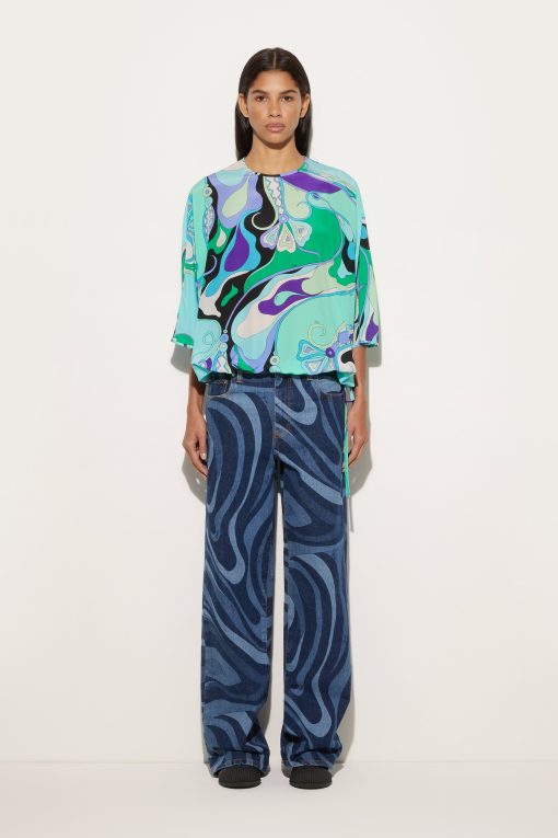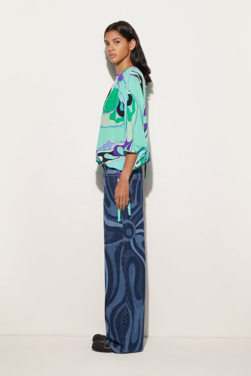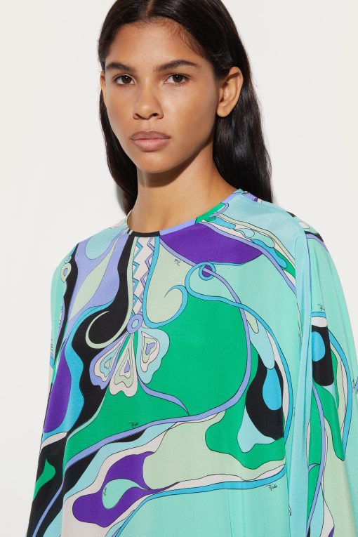 An interplay of volume and lightness for sophisticated and dynamic elegance. This cape-style blouse, made of 100% silk, envelops the silhouette with fluidity, while the high neck adds a touch of sophistication.Ties at each shoulder and near the waist allow you to modulate the fit, creating a delicate drape that enhances the movement of the fabric. The Orchidee print in green and lilac lends freshness and femininity, interpreting the Pucci style with a refined color harmony.