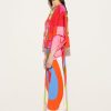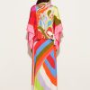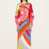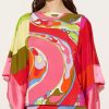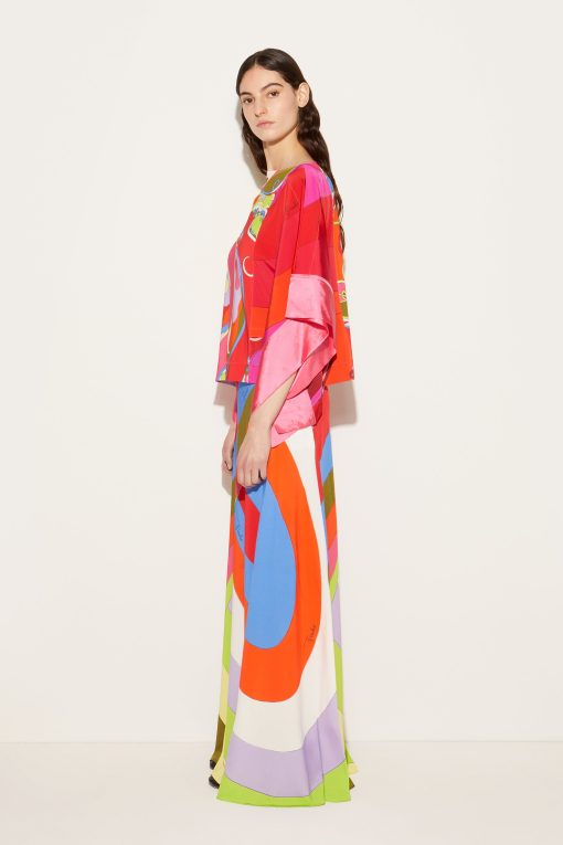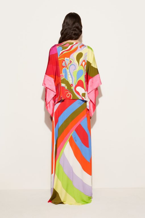 This kaftan top embodies Pucci’s celebration of fluid fabric and languid shapes, showcased through its gracefully draped sleeves. It’s cut with a signature boat neck and adorned with a striking rendition of the archival Orchidee print in vivid red and green tones.