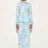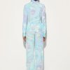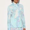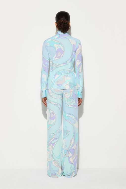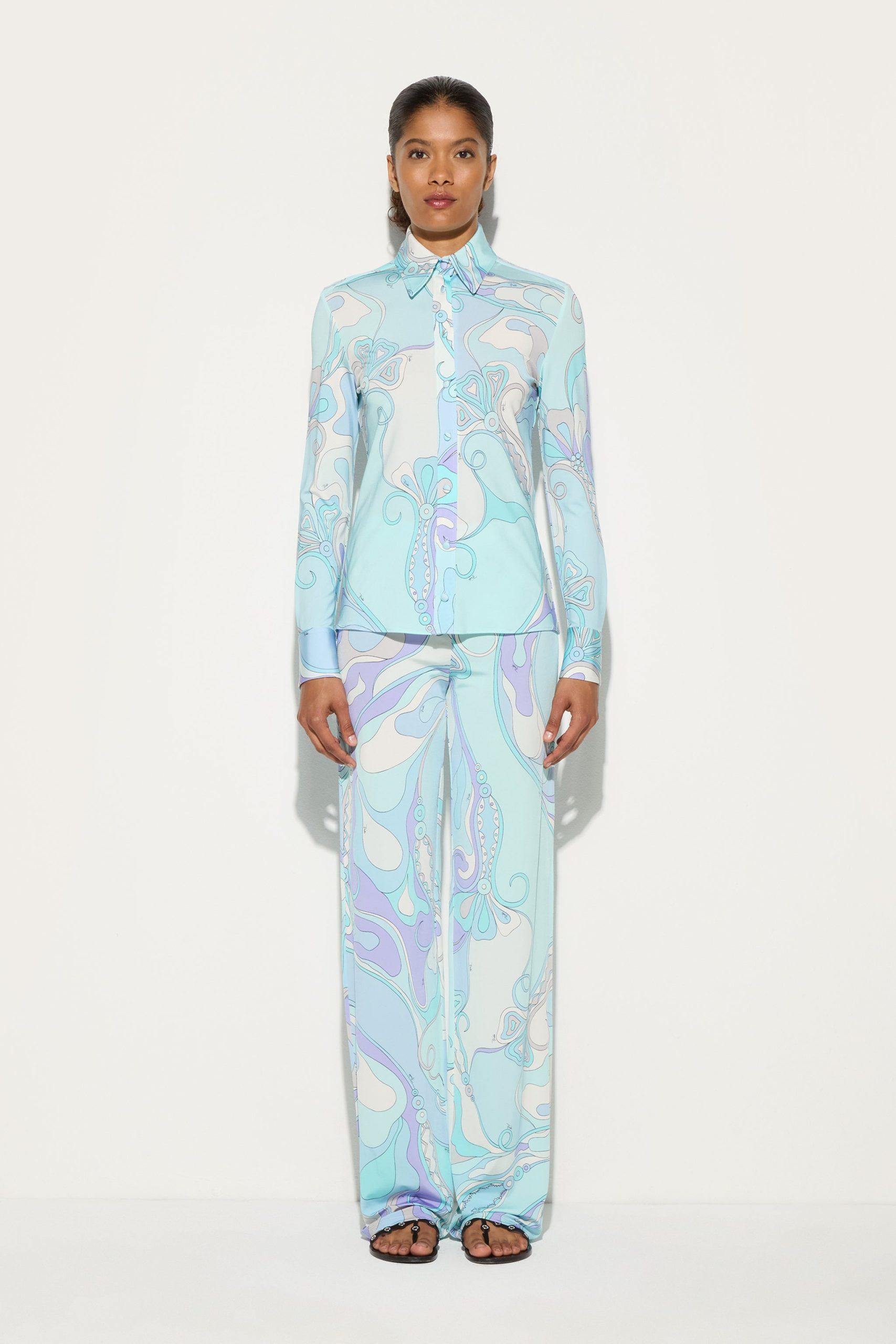 An exclusive selection of Pucci’s iconic garments in an unprecedented version of the Marmo and Orchidee prints in the most delicate shades of aqua. A combination of craftsmanship, color and identity.A timeless classic revisited with a modern twist. This button-down shirt, with its fitted fit and structured collar, is designed for those who love a refined yet contemporary style. The long sleeves and satin jersey enhance every movement, while the Orchidee print adds delicate, feminine elegance.