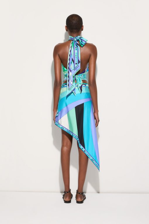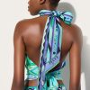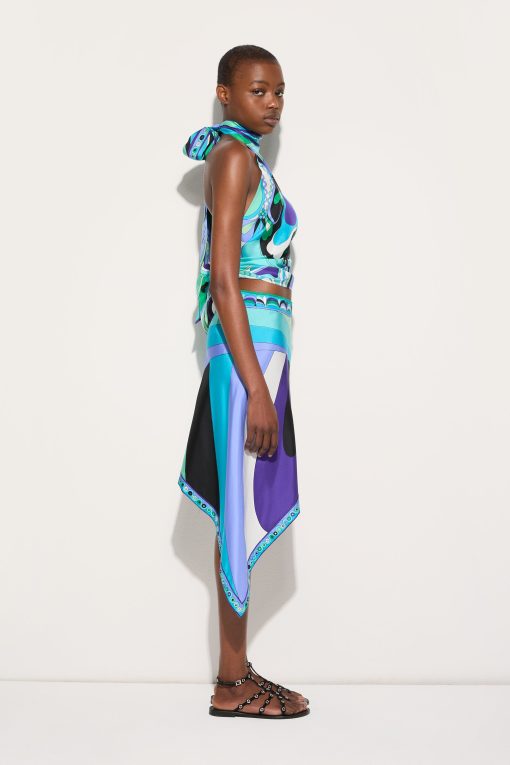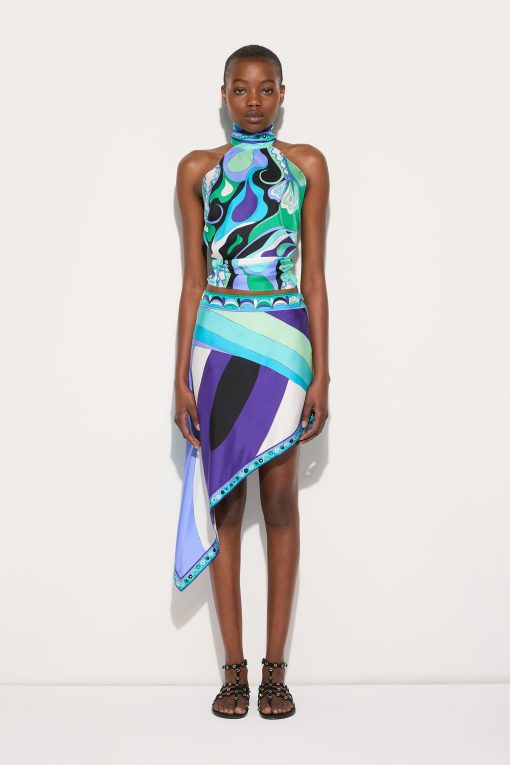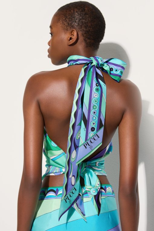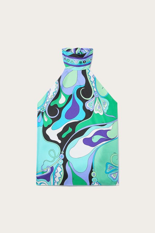 An essential design that combines elegance and lightness. This strapless top with high neck, made of 100% silk, wraps the silhouette with fluidity and sophistication, creating a sophisticated and timeless effect.The Orchidee print in green and lilac, inspired by the Pucci archives, gives a graphic and harmonious touch, emphasizing the natural movement of the fabric. A garment designed for those who love the essence of silk in a modern and sophisticated form.