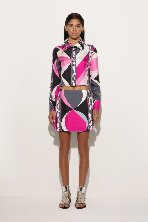 A blend of elegance and creativity, this silk twill cropped shirt reinterprets Pucci tradition with a twist. The long sleeves, classic collar and button closure create a timeless silhouette, while the print adds a unique and playful charm to the design, evokeing lightness and movement. This shirt enhances the natural luster and softness of silk, making it perfect for elegant occasions or for adding a sophisticated touch to your everyday life.