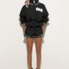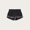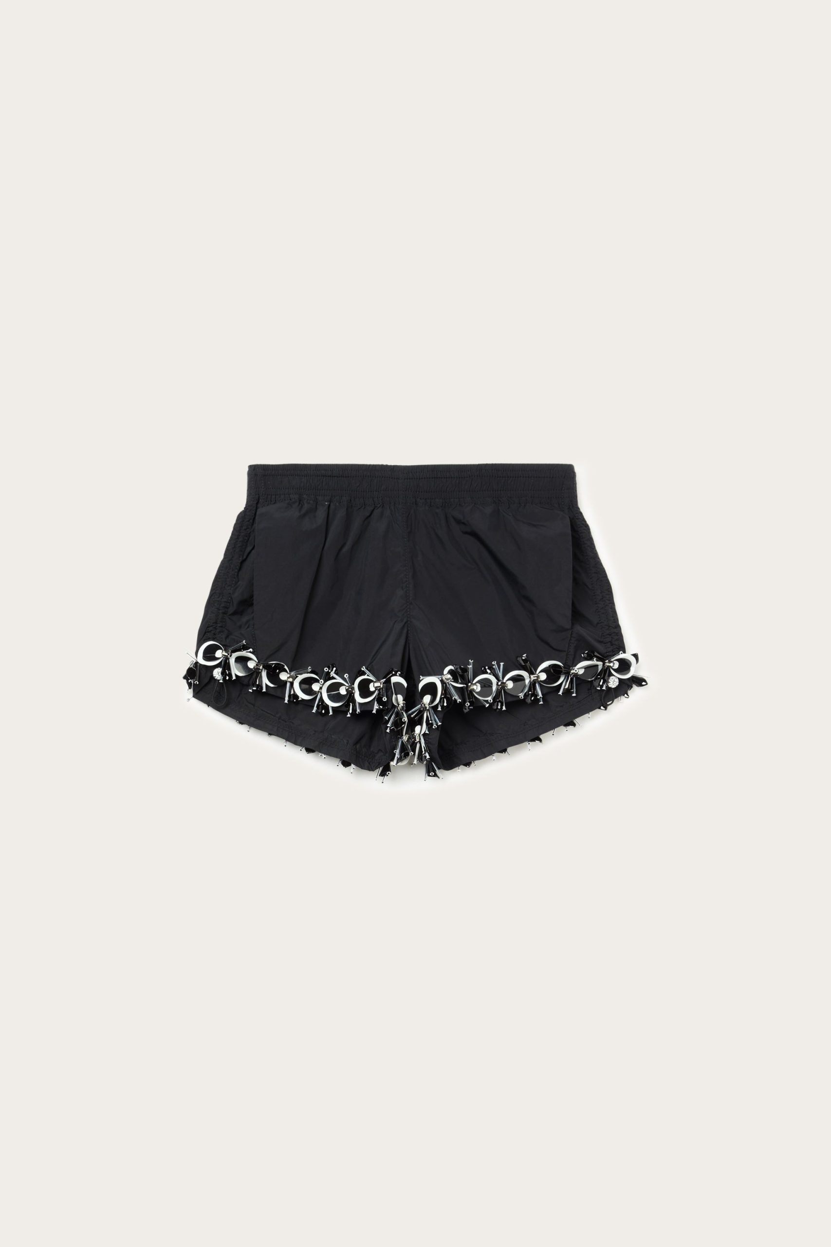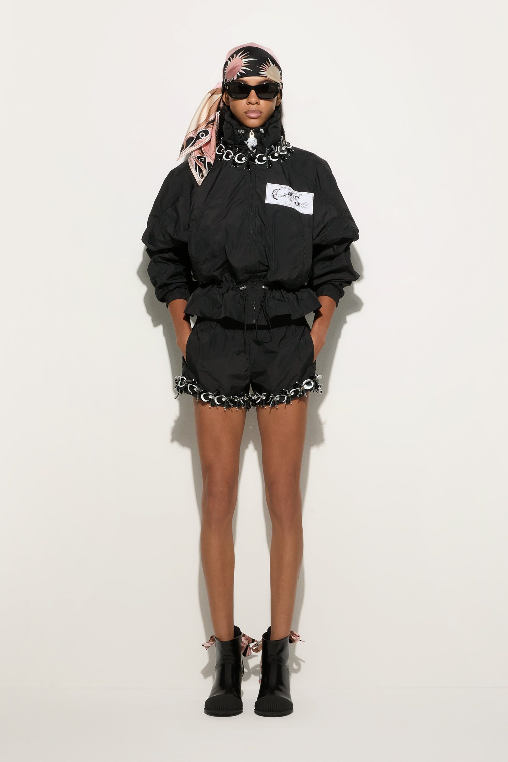 If you’re looking for a garment that combines playful spirit and couture details, these embroidered shorts are the perfect choice. Their essential design is embellished with handmade embroidery that echoes the Pucci Pesci logo, adding a touch of character and uniqueness.Edges layered with sequins of different sizes and colors create a sparkling and sophisticated effect, while enameled metal cones and black diamond rhinestones add a bold and glamorous note. Made from a nylon fabric, they are ideal for those who like to experiment with style without sacrificing sophistication.