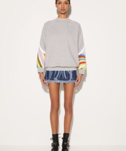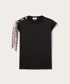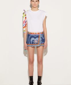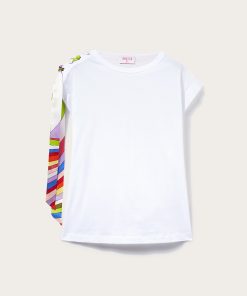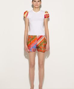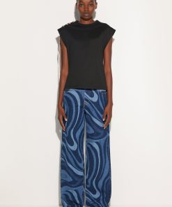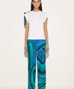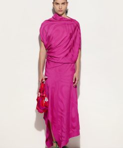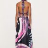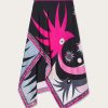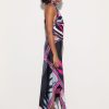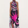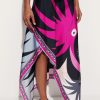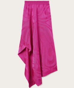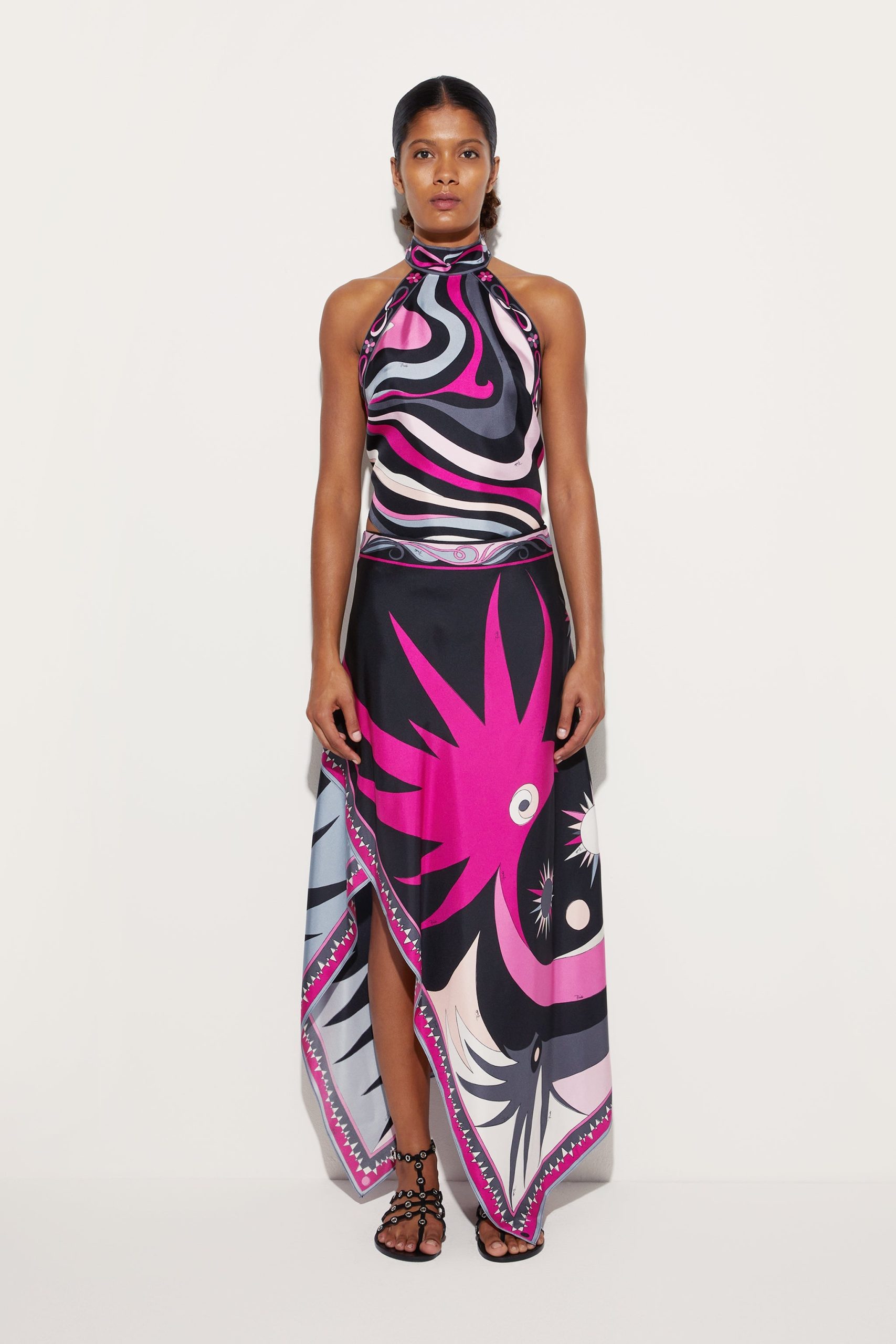 This asymmetrical skirt, with its sinuous hemline from knee to ankle, embodies elegance and movement, designed to enhance the silhouette with a sophisticated and dynamic touch. Generous draping creates a fluid and refined effect, while the defined band adds structure to the design.The Stella print in black and fuchsia, with its iconic and bold design, lends distinctive character to a garment that lends itself to any special occasion.