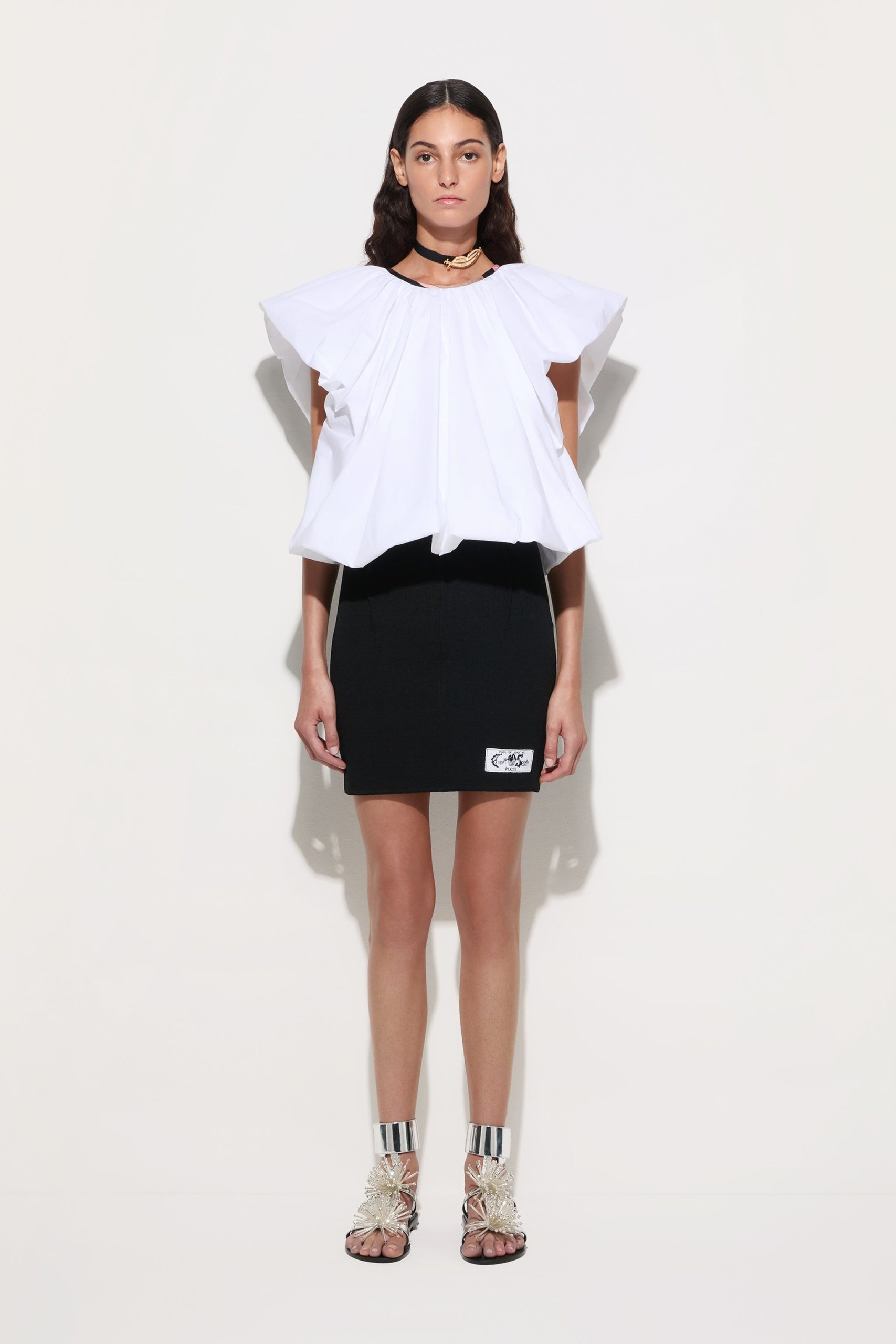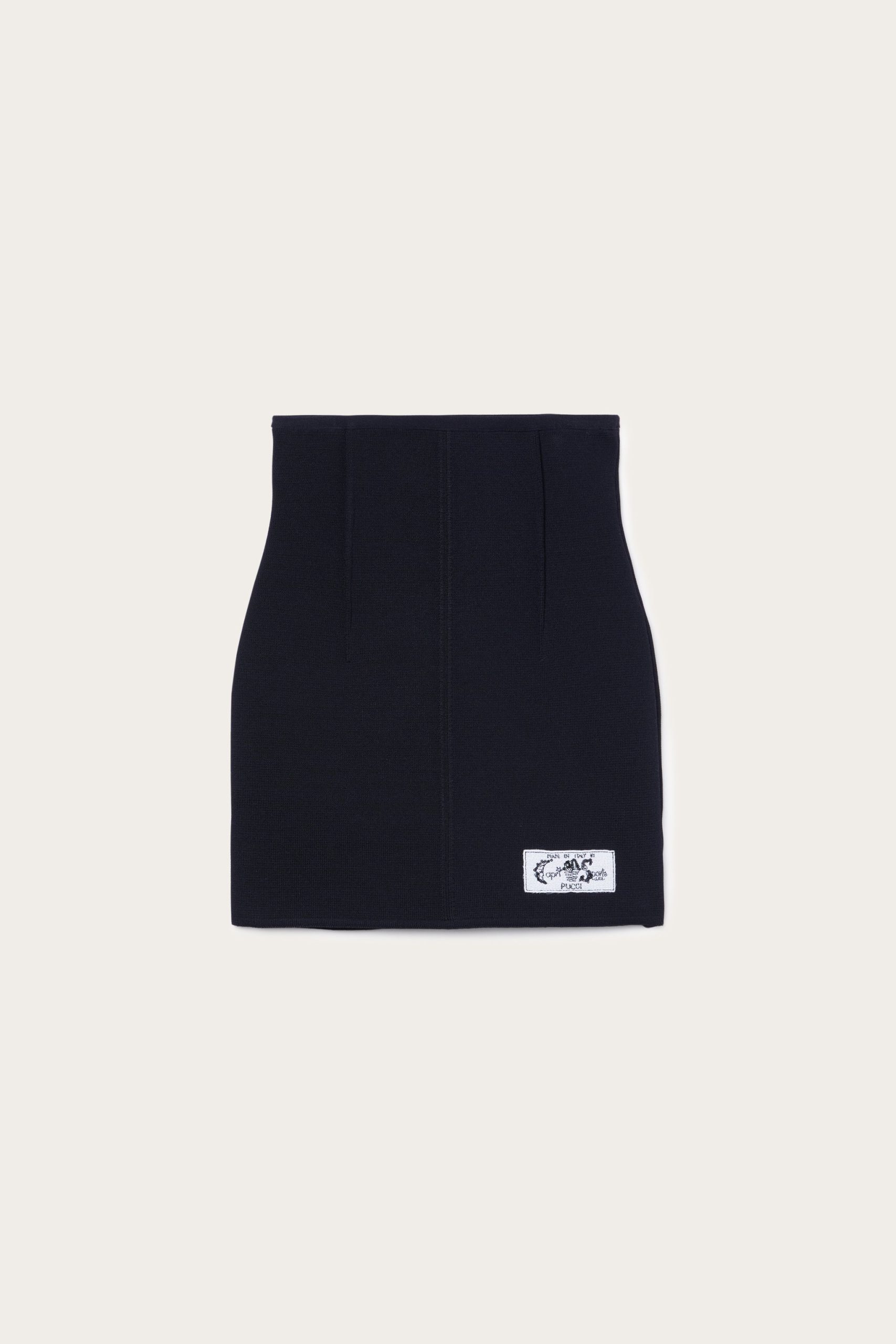 An essential and sophisticated silhouette, perfect for enhancing the shape with elegance. This bodycon miniskirt is made of a structured fabric that ensures a flawless and comfortable fit. The fitted design is embellished with the Pucci label embroidered on the front, a distinctive detail that underscores the brand’s identity. The timeless and versatile black color makes it a key garment for looks with a contemporary spirit.