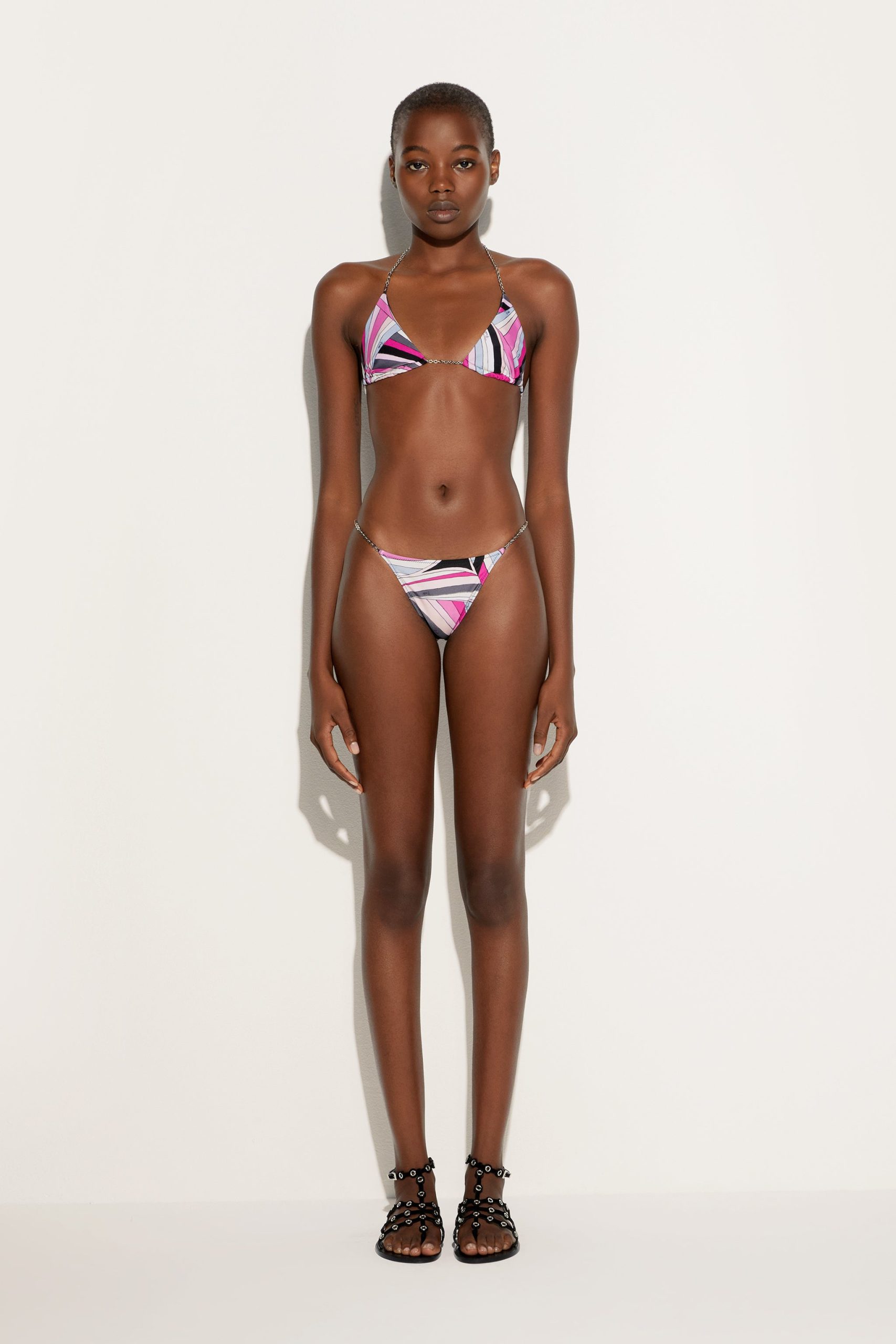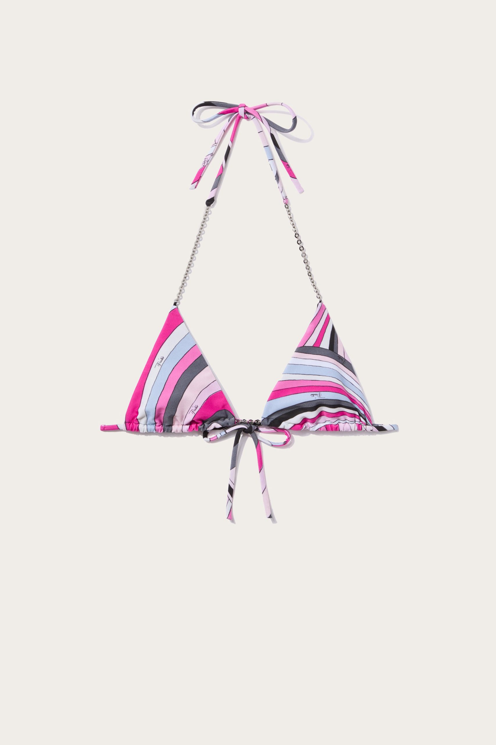 A perfect mix of sensuality and precious details. This triangle bikini top is embellished with metal chain ties, which add a sophisticated touch to the essential design. Made of stretch lycra with anti-UV treatment, it ensures a comfortable fit and extra protection under the sun.The Iride print in shades of black and fuchsia gives a graphic and vibrant appeal, emphasizing the distinctive character of the Pucci world. A garment that does not go unnoticed, perfect for those who like to combine elegance and modernity even at the beach.