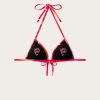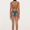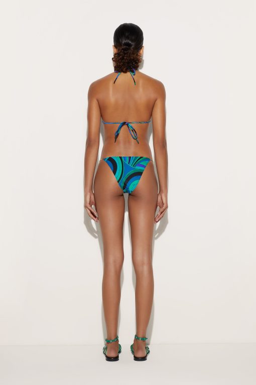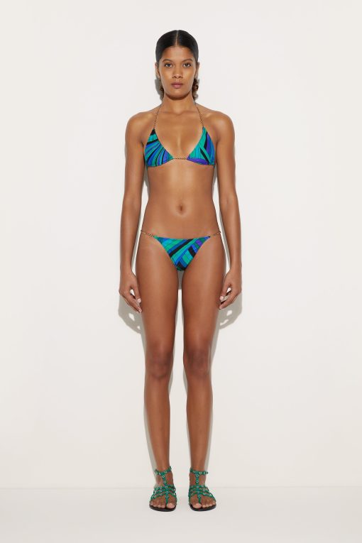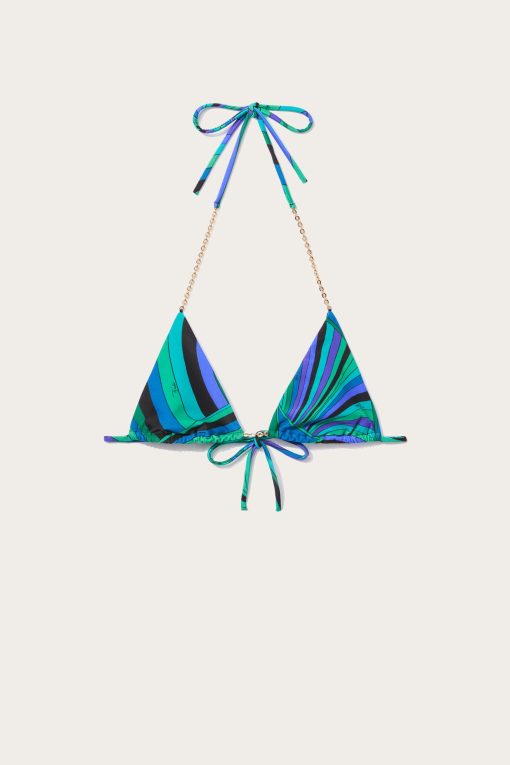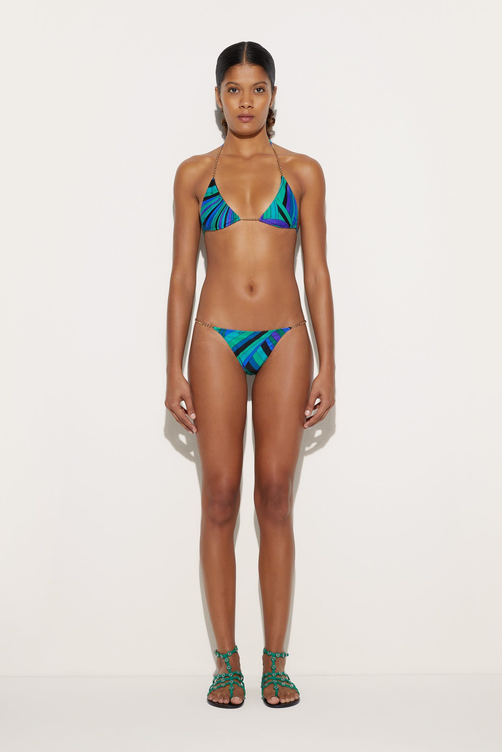 A perfect mix of sensuality and precious details. This triangle bikini top is embellished with metal chain ties, which add a sophisticated touch to the essential design. Made of stretch lycra with anti-UV treatment, it ensures a comfortable fit and extra protection under the sun. The Iride print in emerald gives a graphic and vibrant appeal, emphasizing the distinctive character of the Pucci world. A garment that does not go unnoticed, perfect for those who like to combine elegance and modernity even at the beach.