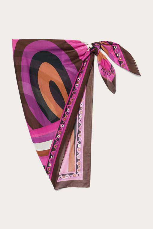 Iride print adorns this lightweight cotton sarong with geometric shapes and graphic lines in complementing purple and brown hues. It can be wrapped around the waist or tied at the neck and styled as a top.