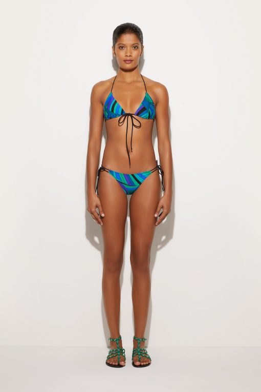 A must-have in your summer wardrobe, these bikini bottoms with adjustable side ties fit your shape perfectly, offering comfort and impeccable style. The Iride print in emerald tones adds a touch of sophistication, while the stretchy lycra with anti-UV treatment provides protection and durability, making them ideal for both the beach and the pool. Pair them with the matching top for a total Pucci look.