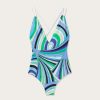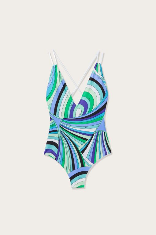Essential elegance and refined details meet in this one-piece swimsuit with a slinky design. The deep V-neckline enhances the silhouette with a sophisticated touch, while the double thin straps add lightness and femininity to the look. Made of stretch lycra with anti-UV treatment, it provides a snug fit and sun protection, combining comfort and performance. The Iride print in shades of green and lilac brightens the design with a vibrant and dynamic color mix, perfect for those who love the distinctive appeal of Pucci style.